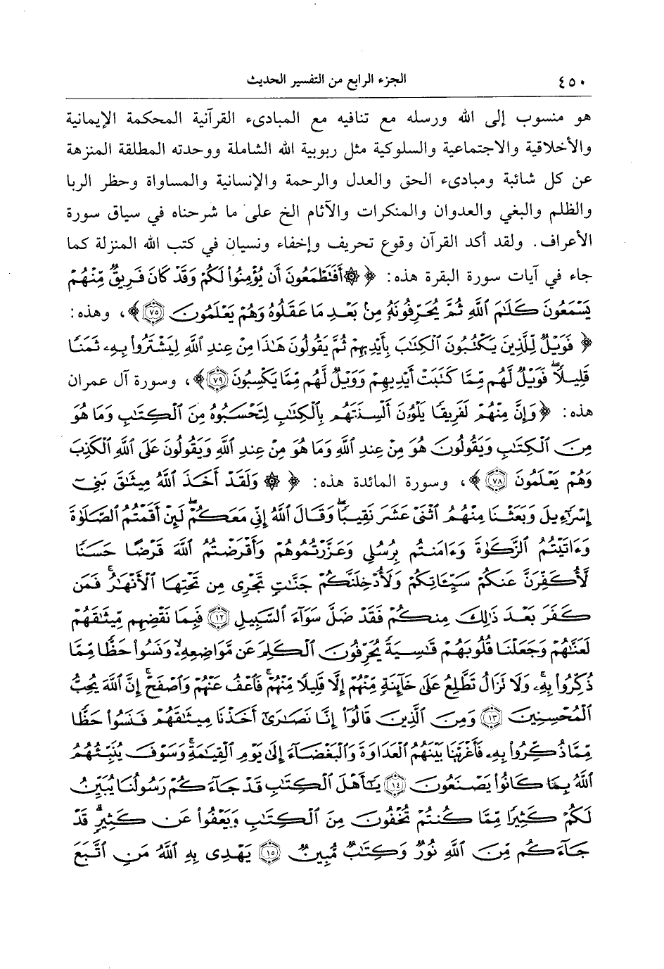 فَوَيْلٌ لِلَّذِينَ يَكْتُبُونَ الْكِتابَ بِأَيْدِيهِمْ ثُمَّ يَقُولُونَ هذا مِنْ عِنْدِ اللَّهِ لِيَشْتَرُوا بِهِ ثَمَناً قَلِيلًا فَوَيْلٌ لَهُمْ مِمَّا كَتَبَتْ أَيْدِيهِمْ وَوَيْلٌ لَهُمْ مِمَّا يَكْسِبُونَ (79) ، وسورة آل عمران هذه: وَإِنَّ مِنْهُمْ لَفَرِيقاً يَلْوُونَ أَلْسِنَتَهُمْ بِالْكِتابِ لِتَحْسَبُوهُ مِنَ الْكِتابِ وَما هُوَ مِنَ الْكِتابِ وَيَقُولُونَ هُوَ مِنْ عِنْدِ اللَّهِ وَما هُوَ مِنْ عِنْدِ اللَّهِ وَيَقُولُونَ عَلَى اللَّهِ الْكَذِبَ وَهُمْ يَعْلَمُونَ (78) ، وسورة المائدة هذه: وَلَقَدْ أَخَذَ اللَّهُ مِيثاقَ بَنِي إِسْرائِيلَ وَبَعَثْنا مِنْهُمُ اثْنَيْ عَشَرَ نَقِيباً وَقالَ اللَّهُ إِنِّي مَعَكُمْ لَئِنْ أَقَمْتُمُ الصَّلاةَ وَآتَيْتُمُ الزَّكاةَ وَآمَنْتُمْ بِرُسُلِي وَعَزَّرْتُمُوهُمْ وَأَقْرَضْتُمُ اللَّهَ قَرْضاً حَسَناً لَأُكَفِّرَنَّ عَنْكُمْ سَيِّئاتِكُمْ وَلَأُدْخِلَنَّكُمْ جَنَّاتٍ تَجْرِي مِنْ تَحْتِهَا الْأَنْهارُ فَمَنْ كَفَرَ بَعْدَ ذلِكَ مِنْكُمْ فَقَدْ ضَلَّ سَواءَ السَّبِيلِ (12) فَبِما نَقْضِهِمْ مِيثاقَهُمْ لَعَنَّاهُمْ وَجَعَلْنا قُلُوبَهُمْ قاسِيَةً يُحَرِّفُونَ الْكَلِمَ عَنْ مَواضِعِهِ وَنَسُوا حَظًّا مِمَّا ذُكِّرُوا بِهِ وَلا تَزالُ تَطَّلِعُ عَلى خائِنَةٍ مِنْهُمْ إِلَّا قَلِيلًا مِنْهُمْ فَاعْفُ عَنْهُمْ وَاصْفَحْ إِنَّ اللَّهَ يُحِبُّ الْمُحْسِنِينَ (13) وَمِنَ الَّذِينَ قالُوا إِنَّا نَصارى أَخَذْنا مِيثاقَهُمْ فَنَسُوا حَظًّا مِمَّا ذُكِّرُوا بِهِ فَأَغْرَيْنا بَيْنَهُمُ الْعَداوَةَ وَالْبَغْضاءَ إِلى يَوْمِ الْقِيامَةِ وَسَوْفَ يُنَبِّئُهُمُ اللَّهُ بِما كانُوا يَصْنَعُونَ (14) يا أَهْلَ الْكِتابِ قَدْ جاءَكُمْ رَسُولُنا يُبَيِّنُ لَكُمْ كَثِيراً مِمَّا كُنْتُمْ تُخْفُونَ مِنَ الْكِتابِ وَيَعْفُوا عَنْ كَثِيرٍ قَدْ جاءَكُمْ مِنَ اللَّهِ نُورٌ وَكِتابٌ مُبِينٌ (15) يَهْدِي بِهِ اللَّهُ مَنِ اتَّبَعَ
