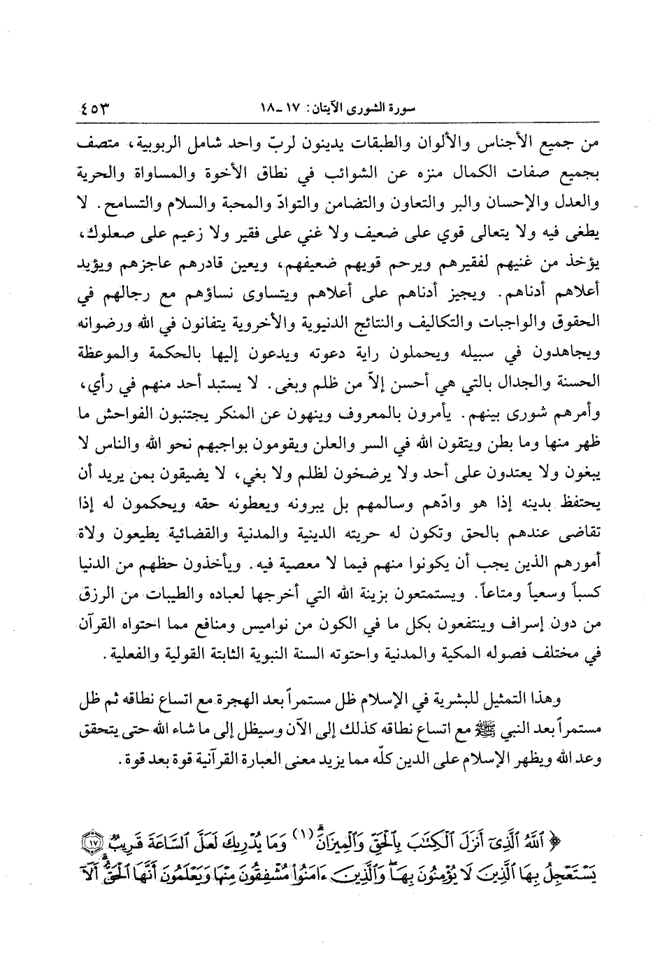 من جميع الأجناس والألوان والطبقات يدينون لربّ واحد شامل الربوبية، متصف بجميع صفات الكمال منزه عن الشوائب في نطاق الأخوة والمساواة والحرية والعدل والإحسان والبر والتعاون والتضامن والتوادّ والمحبة والسلام والتسامح. لا يطغى فيه ولا يتعالي قوي على ضعيف ولا غني على فقير ولا زعيم على صعلوك، يؤخذ من غنيهم لفقيرهم ويرحم قويهم ضعيفهم، ويعين قادرهم عاجزهم ويؤيد أعلاهم أدناهم. ويجيز أدناهم على أعلاهم ويتساوى نساؤهم مع رجالهم في الحقوق والواجبات والتكاليف والنتائج الدنيوية والأخروية يتفانون في الله ورضوانه ويجاهدون في سبيله ويحملون راية دعوته ويدعون إليها بالحكمة والموعظة الحسنة والجدال بالتي هي أحسن إلّا من ظلم وبغى. لا يستبد أحد منهم في رأي، وأمرهم شورى بينهم. يأمرون بالمعروف وينهون عن المنكر يجتنبون الفواحش ما ظهر منها وما بطن ويتقون الله في السر والعلن ويقومون بواجبهم نحو الله والناس لا يبغون ولا يعتدون على أحد ولا يرضخون لظلم ولا بغي، لا يضيقون بمن يريد أن يحتفظ بدينه إذا هو وادّهم وسالمهم بل يبرونه ويعطونه حقه ويحكمون له إذا تقاضى عندهم بالحق وتكون له حريته الدينية والمدنية والقضائية يطيعون ولاة أمورهم الذين يجب أن يكونوا منهم فيما لا معصية فيه. ويأخذون حظهم من الدنيا كسبا وسعيا ومتاعا. ويستمتعون بزينة الله التي أخرجها لعباده والطيبات من الرزق من دون إسراف وينتفعون بكل ما في الكون من نواميس ومنافع مما احتواه القرآن في مختلف فصوله المكية والمدنية واحتوته السنة النبوية الثابتة القولية والفعلية.
