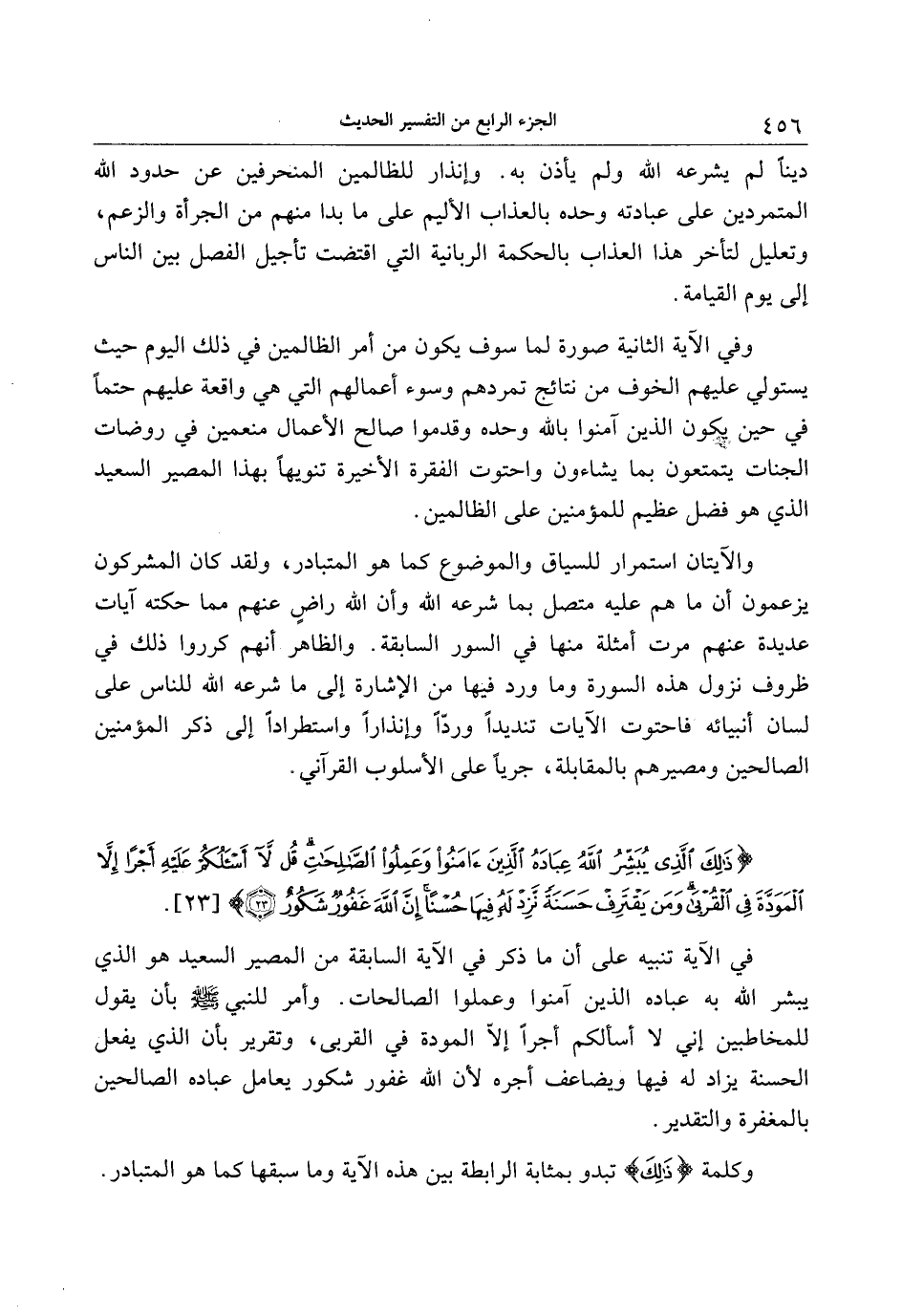. في الآية تنبيه على أن ما ذكر في الآية السابقة من المصير السعيد هو الذي يبشر الله به عباده الذين آمنوا وعملوا الصالحات. وأمر للنبي صلى الله عليه وسلم بأن يقول للمخاطبين إني لا أسألكم أجرا إلّا المودة في القربى، وتقرير بأن الذي يفعل الحسنة يزاد له فيها ويضاعف أجره لأن الله غفور شكور يعامل عباده الصالحين بالمغفرة والتقدير.