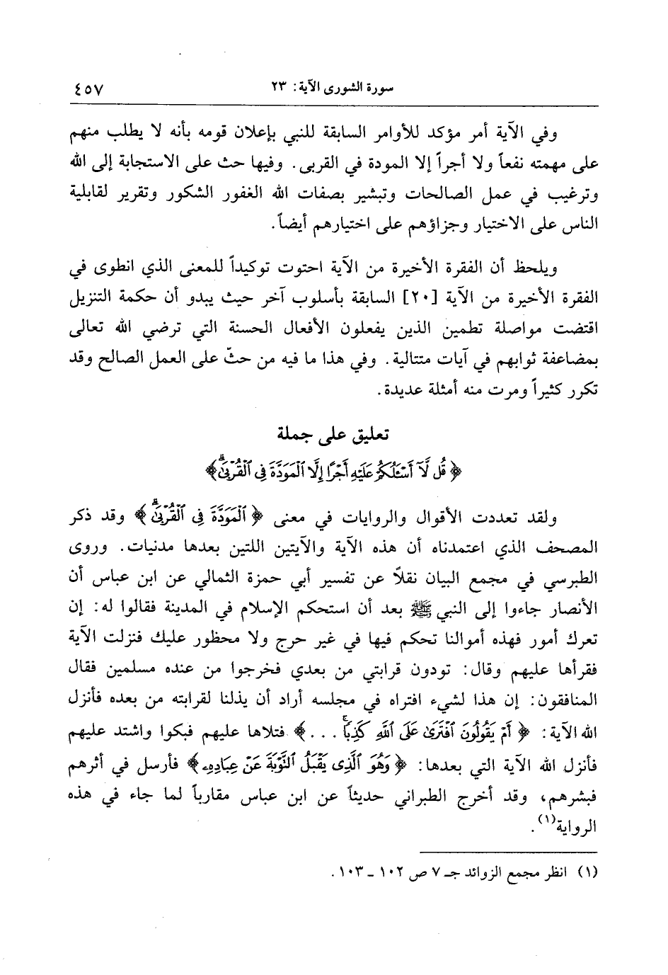 ولقد تعددت الأقوال والروايات في معنى الْمَوَدَّةَ فِي الْقُرْبى وقد ذكر المصحف الذي اعتمدناه أن هذه الآية والآيتين اللتين بعدها مدنيات. وروى الطبرسي في مجمع البيان نقلا عن تفسير أبي حمزة الثمالي عن ابن عباس أن الأنصار جاءوا إلى النبي صلى الله عليه وسلم بعد أن استحكم الإسلام في المدينة فقالوا له: إن تعرك أمور فهذه أموالنا تحكم فيها في غير حرج ولا محظور عليك فنزلت الآية فقرأها عليهم وقال: تودون قرابتي من بعدي فخرجوا من عنده مسلمين فقال المنافقون: إن هذا لشيء افتراه في مجلسه أراد أن يذلنا لقرابته من بعده فأنزل الله الآية: أَمْ يَقُولُونَ افْتَرى عَلَى اللَّهِ كَذِباً ... فتلاها عليهم فبكوا واشتد عليهم فأنزل الله الآية التي بعدها: وَهُوَ الَّذِي يَقْبَلُ التَّوْبَةَ عَنْ عِبادِهِ فأرسل في أثرهم فبشرهم، وقد أخرج الطبراني حديثا عن ابن عباس مقاربا لما جاء في هذه الرواية «1» .