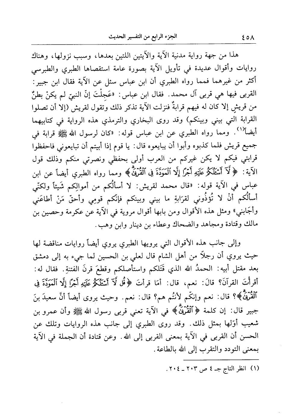 أقرأت القرآن؟ قال: نعم، قال: أما قرأت قُلْ لا أَسْئَلُكُمْ عَلَيْهِ أَجْراً إِلَّا الْمَوَدَّةَ فِي الْقُرْبى؟ قال: نعم وإنّكم لأنتم هم؟ قال: نعم. وحيث يروى أيضا أنّ سعيد بن جبير قال: إن كلمة الْقُرْبى في الآية تعني قربى رسول الله صلى الله عليه وسلم وأن عمرو بن شعيب أوّلها بمثل ذلك. وقد روى الطبري إلى جانب هذه الروايات وتلك عن الحسن أن القربى في الآية بمعنى القربى إلى الله. وعن قتادة أن الجملة في الآية بمعنى التودد والتقرب إلى الله بالطاعة.
