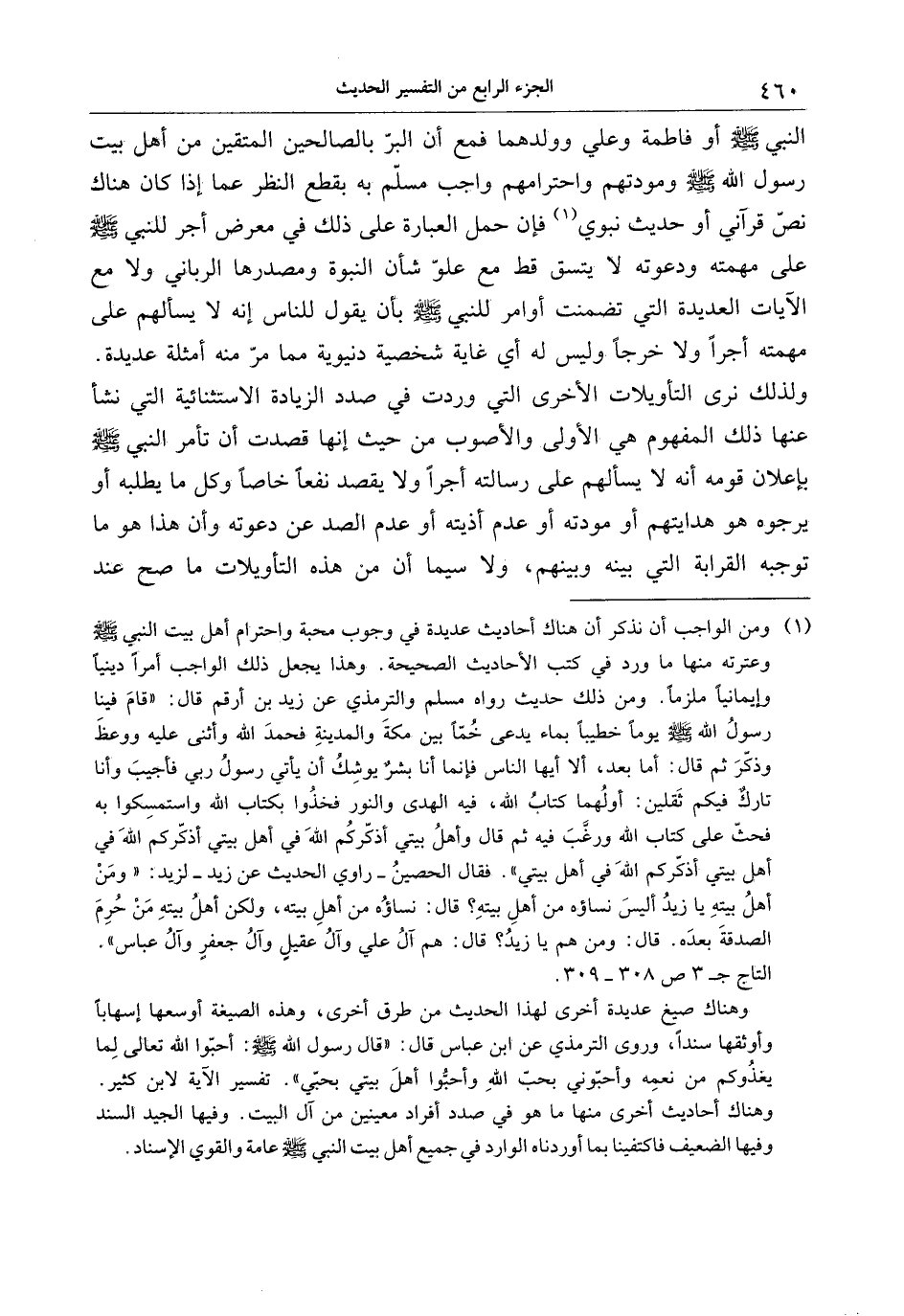 (1) ومن الواجب أن نذكر أن هناك أحاديث عديدة في وجوب محبة واحترام أهل بيت النبي صلى الله عليه وسلم وعترته منها ما ورد في كتب الأحاديث الصحيحة. وهذا يجعل ذلك الواجب أمرا دينيا وإيمانيا ملزما. ومن ذلك حديث رواه مسلم والترمذي عن زيد بن أرقم قال: «قام فينا رسول الله صلى الله عليه وسلم يوما خطيبا بماء يدعى خمّا بين مكة والمدينة فحمد الله وأثنى عليه ووعظ وذكّر ثم قال: أما بعد، ألا أيها الناس فإنما أنا بشر يوشك أن يأتي رسول ربي فأجيب وأنا تارك فيكم ثقلين: أولهما كتاب الله، فيه الهدى والنور فخذوا بكتاب الله واستمسكوا به فحثّ على كتاب الله ورغّب فيه ثم قال وأهل بيتي أذكّركم الله في أهل بيتي أذكّركم الله في أهل بيتي أذكّركم الله في أهل بيتي» . فقال الحصين- راوي الحديث عن زيد- لزيد: «ومن أهل بيته يا زيد أليس نساؤه من أهل بيته؟ قال: نساؤه من أهل بيته، ولكن أهل بيته من حرم الصدقة بعده. قال: ومن هم يا زيد؟ قال: هم آل علي وآل عقيل وآل جعفر وآل عباس» .