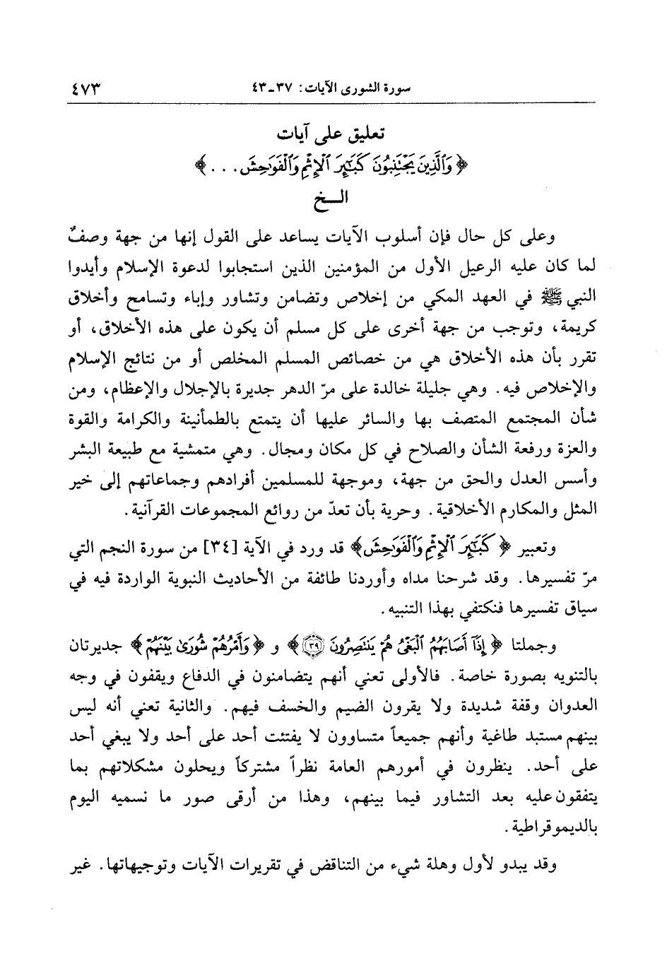 وعلى كل حال فإن أسلوب الآيات يساعد على القول إنها من جهة وصف لما كان عليه الرعيل الأول من المؤمنين الذين استجابوا لدعوة الإسلام وأيدوا النبي صلى الله عليه وسلم في العهد المكي من إخلاص وتضامن وتشاور وإباء وتسامح وأخلاق كريمة، وتوجب من جهة أخرى على كل مسلم أن يكون على هذه الأخلاق، أو تقرر بأن هذه الأخلاق هي من خصائص المسلم المخلص أو من نتائج الإسلام والإخلاص فيه. وهي جليلة خالدة على مرّ الدهر جديرة بالإجلال والإعظام، ومن شأن المجتمع المتصف بها والسائر عليها أن يتمتع بالطمأنينة والكرامة والقوة والعزة ورفعة الشأن والصلاح في كل مكان ومجال. وهي متمشية مع طبيعة البشر وأسس العدل والحق من جهة، وموجهة للمسلمين أفرادهم وجماعاتهم إلى خير المثل والمكارم الأخلاقية. وحرية بأن تعدّ من روائع المجموعات القرآنية.