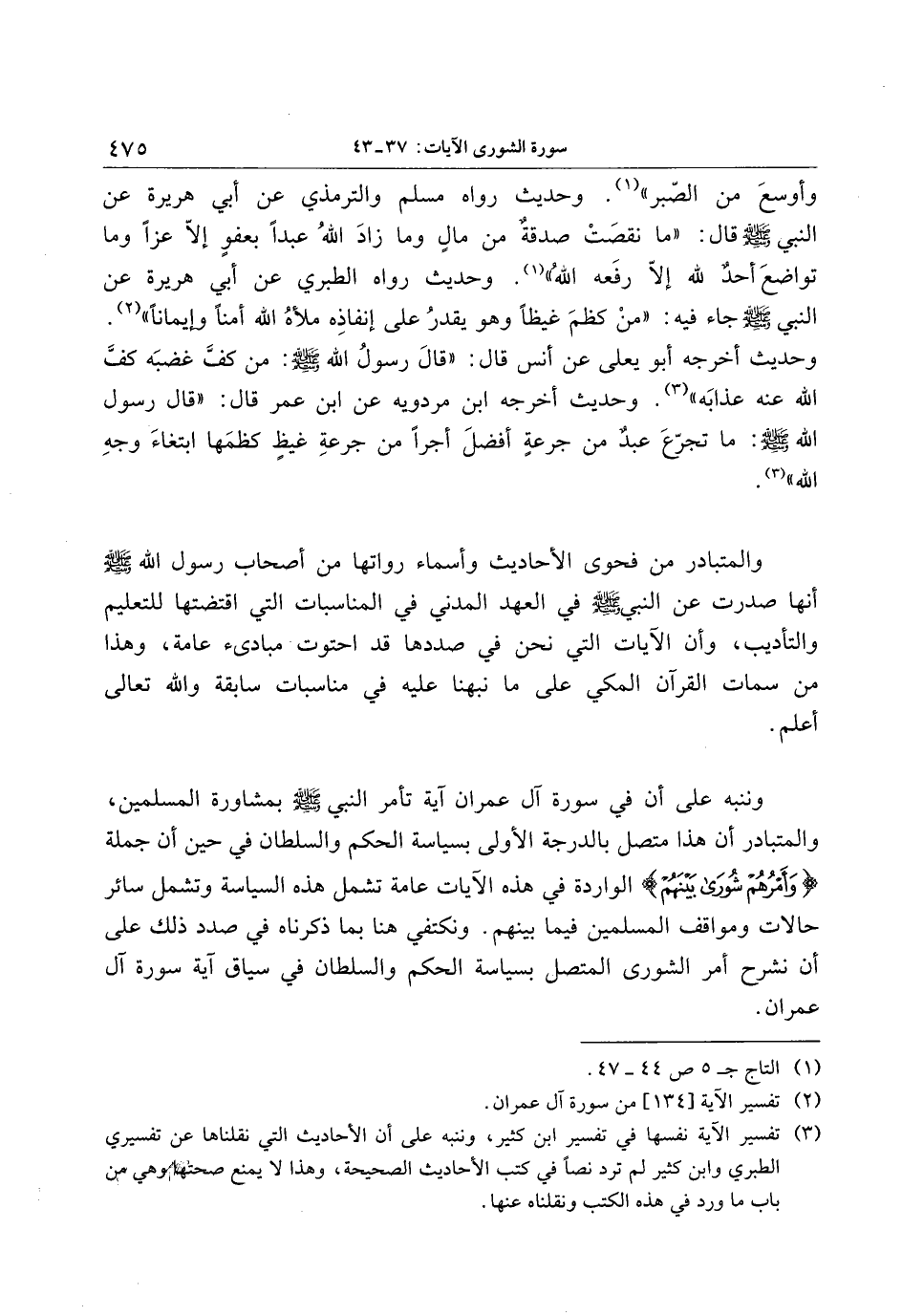 وننبه على أن في سورة آل عمران آية تأمر النبي صلى الله عليه وسلم بمشاورة المسلمين، والمتبادر أن هذا متصل بالدرجة الأولى بسياسة الحكم والسلطان في حين أن جملة وَأَمْرُهُمْ شُورى بَيْنَهُمْ الواردة في هذه الآيات عامة تشمل هذه السياسة وتشمل سائر حالات ومواقف المسلمين فيما بينهم. ونكتفي هنا بما ذكرناه في صدد ذلك على أن نشرح أمر الشورى المتصل بسياسة الحكم والسلطان في سياق آية سورة آل عمران.