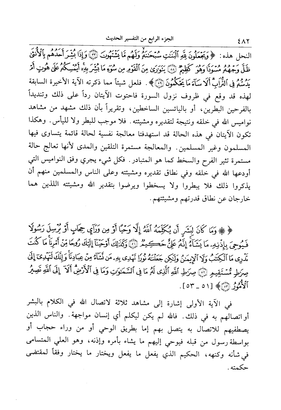 وَما كانَ لِبَشَرٍ أَنْ يُكَلِّمَهُ اللَّهُ إِلاَّ وَحْياً أَوْ مِنْ وَراءِ حِجابٍ أَوْ يُرْسِلَ رَسُولاً فَيُوحِيَ بِإِذْنِهِ ما يَشاءُ إِنَّهُ عَلِيٌّ حَكِيمٌ (51) وَكَذلِكَ أَوْحَيْنا إِلَيْكَ رُوحاً مِنْ أَمْرِنا ما كُنْتَ تَدْرِي مَا الْكِتابُ وَلا الْإِيمانُ وَلكِنْ جَعَلْناهُ نُوراً نَهْدِي بِهِ مَنْ نَشاءُ مِنْ عِبادِنا وَإِنَّكَ لَتَهْدِي إِلى صِراطٍ مُسْتَقِيمٍ (52) صِراطِ اللَّهِ الَّذِي لَهُ ما فِي السَّماواتِ وَما فِي الْأَرْضِ أَلا إِلَى اللَّهِ تَصِيرُ الْأُمُورُ (53)