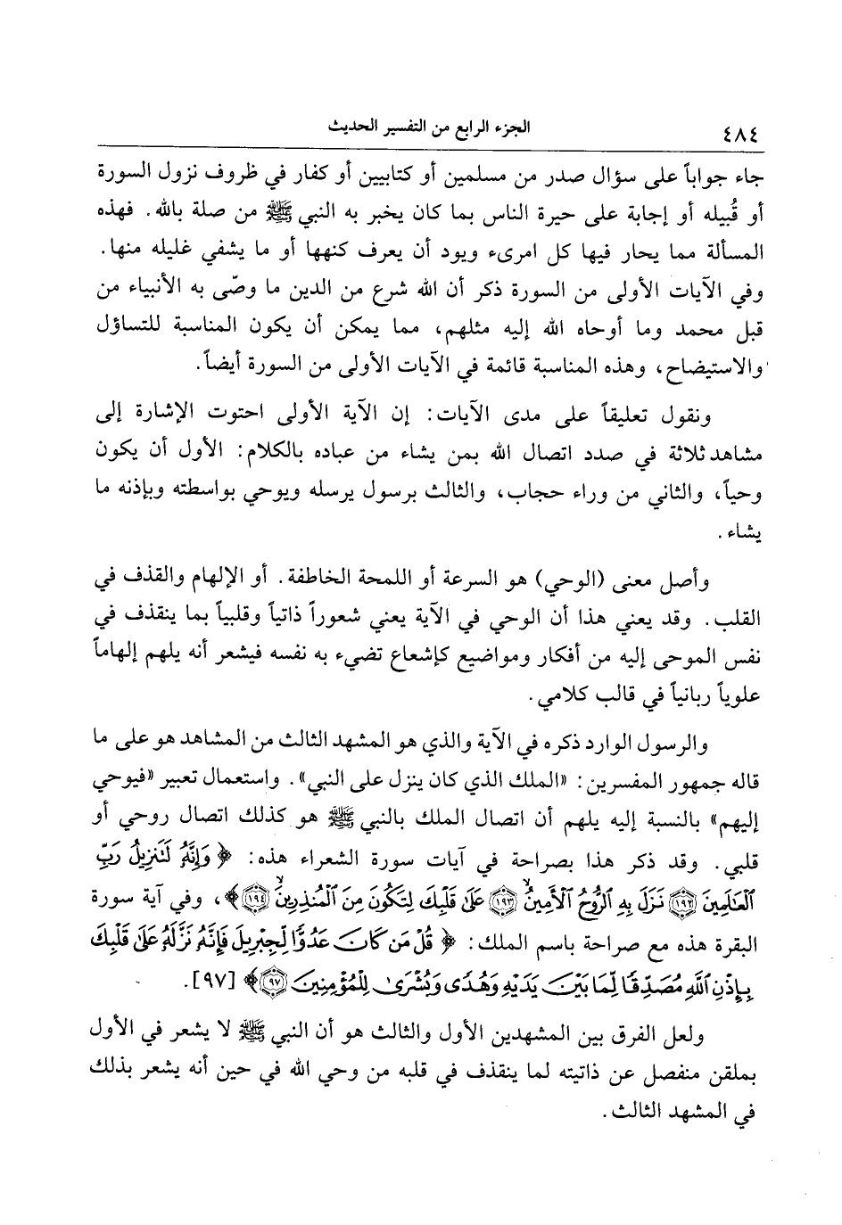والرسول الوارد ذكره في الآية والذي هو المشهد الثالث من المشاهد هو على ما قاله جمهور المفسرين: «الملك الذي كان ينزل على النبي صلّى الله عليه وسلم» . واستعمال تعبير «فيوحي إليهم» بالنسبة إليه يلهم أن اتصال الملك بالنبي صلّى الله عليه وسلم هو كذلك اتصال روحي أو قلبي. وقد ذكر هذا بصراحة في آيات سورة الشعراء هذه: وَإِنَّهُ لَتَنْزِيلُ رَبِّ الْعالَمِينَ (192) نَزَلَ بِهِ الرُّوحُ الْأَمِينُ (193) عَلى قَلْبِكَ لِتَكُونَ مِنَ الْمُنْذِرِينَ (194) ، وفي آية سورة البقرة هذه مع صراحة باسم الملك: قُلْ مَنْ كانَ عَدُوًّا لِجِبْرِيلَ فَإِنَّهُ نَزَّلَهُ عَلى قَلْبِكَ بِإِذْنِ اللَّهِ مُصَدِّقاً لِما بَيْنَ يَدَيْهِ وَهُدىً وَبُشْرى لِلْمُؤْمِنِينَ (97) [97] .