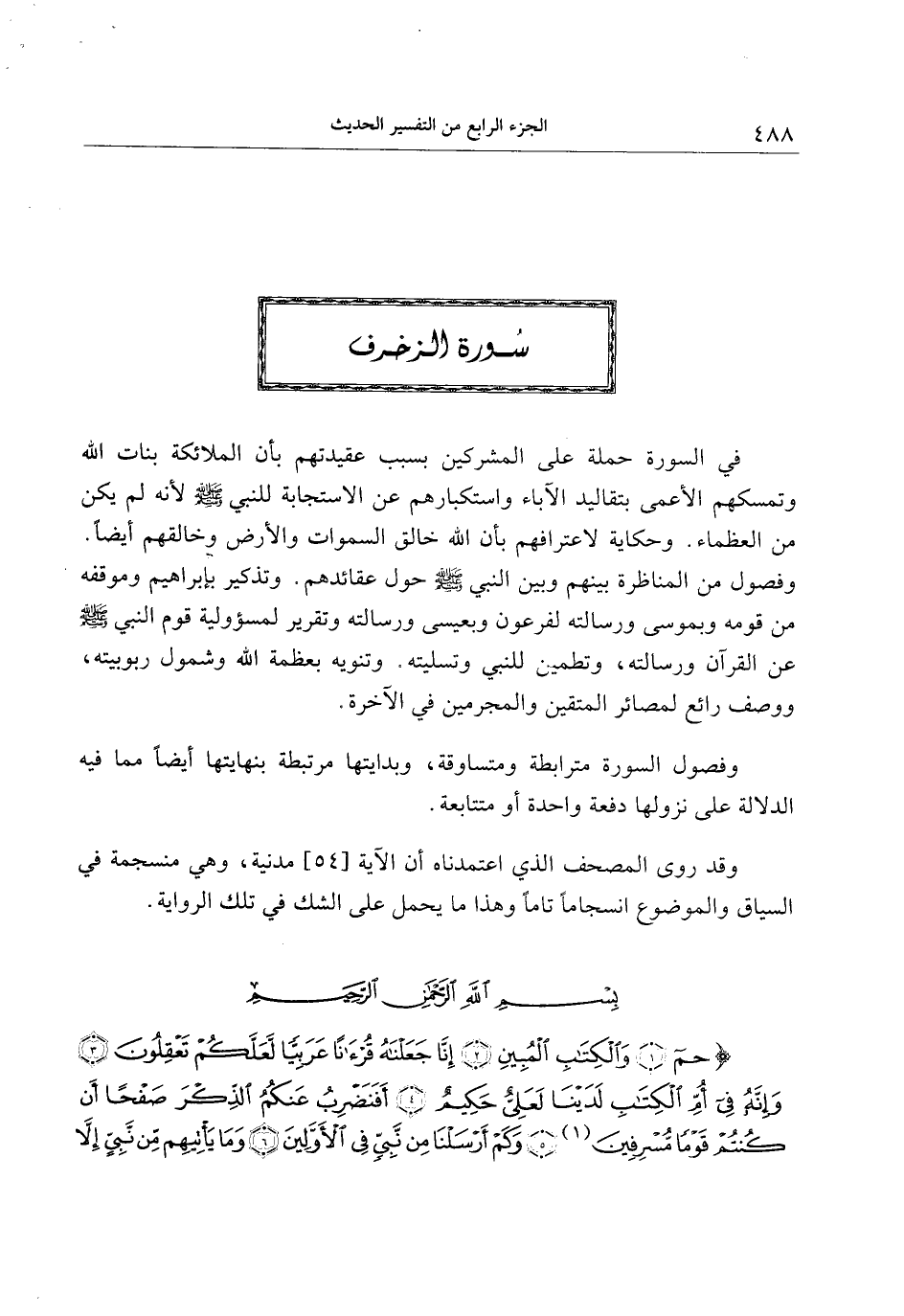وفصول من المناظرة بينهم وبين النبي صلّى الله عليه وسلم حول عقائدهم. وتذكير بإبراهيم وموقفه من قومه وبموسى ورسالته لفرعون وبعيسى ورسالته وتقرير لمسؤولية قوم النبي صلّى الله عليه وسلم عن القرآن ورسالته، وتطمين للنبي وتسليته. وتنويه بعظمة الله وشمول ربوبيته، ووصف رائع لمصائر المتقين والمجرمين في الآخرة.
