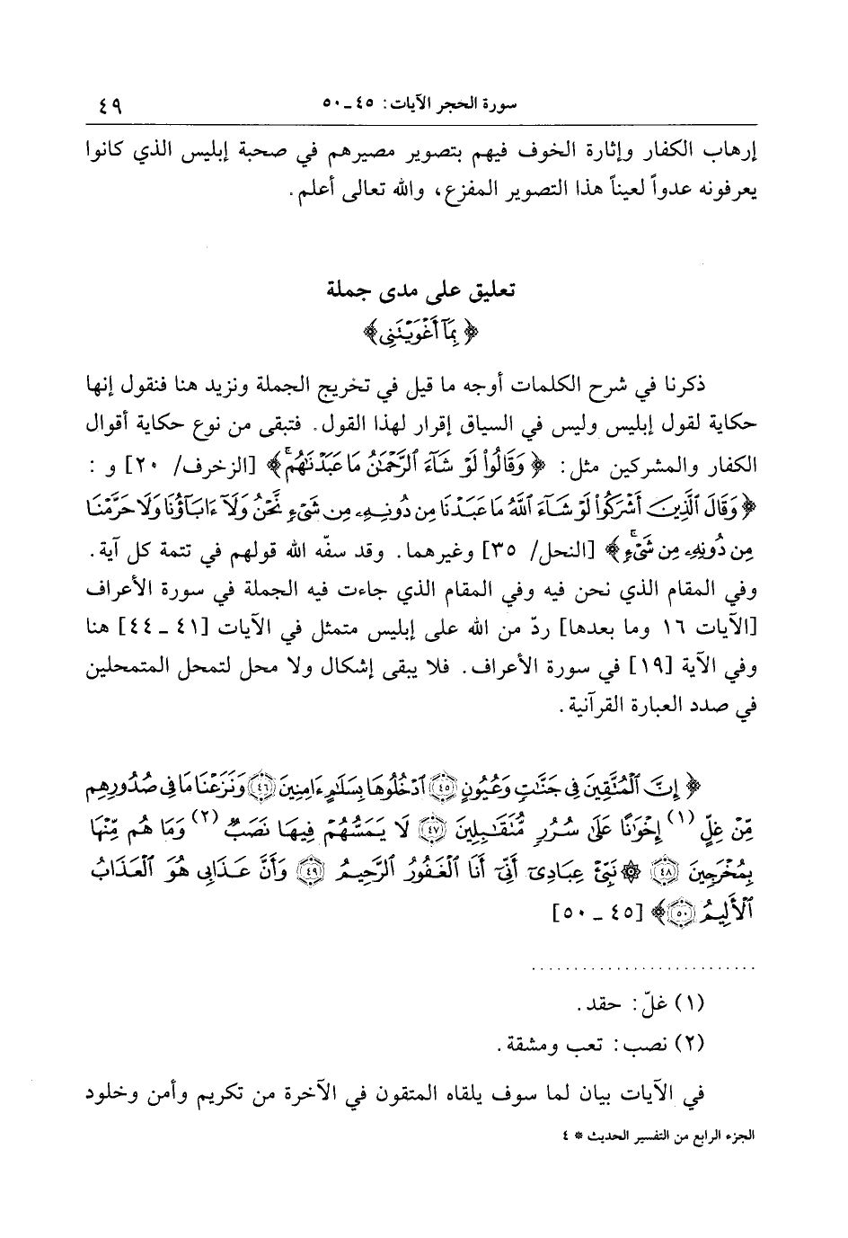 إِنَّ الْمُتَّقِينَ فِي جَنَّاتٍ وَعُيُونٍ (45) ادْخُلُوها بِسَلامٍ آمِنِينَ (46) وَنَزَعْنا ما فِي صُدُورِهِمْ مِنْ غِلٍّ إِخْواناً عَلى سُرُرٍ مُتَقابِلِينَ (47) لا يَمَسُّهُمْ فِيها نَصَبٌ وَما هُمْ مِنْها بِمُخْرَجِينَ (48) نَبِّئْ عِبادِي أَنِّي أَنَا الْغَفُورُ الرَّحِيمُ (49)