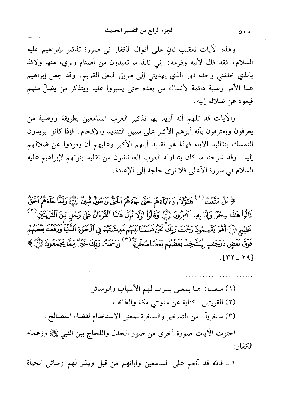 بَلْ مَتَّعْتُ هؤُلاءِ وَآباءَهُمْ حَتَّى جاءَهُمُ الْحَقُّ وَرَسُولٌ مُبِينٌ (29) وَلَمَّا جاءَهُمُ الْحَقُّ قالُوا هذا سِحْرٌ وَإِنَّا بِهِ كافِرُونَ (30) وَقالُوا لَوْلا نُزِّلَ هذَا الْقُرْآنُ عَلى رَجُلٍ مِنَ الْقَرْيَتَيْنِ عَظِيمٍ (31) أَهُمْ يَقْسِمُونَ رَحْمَتَ رَبِّكَ نَحْنُ قَسَمْنا بَيْنَهُمْ مَعِيشَتَهُمْ فِي الْحَياةِ الدُّنْيا وَرَفَعْنا بَعْضَهُمْ فَوْقَ بَعْضٍ دَرَجاتٍ لِيَتَّخِذَ بَعْضُهُمْ بَعْضاً سُخْرِيًّا وَرَحْمَتُ رَبِّكَ خَيْرٌ مِمَّا يَجْمَعُونَ (32)