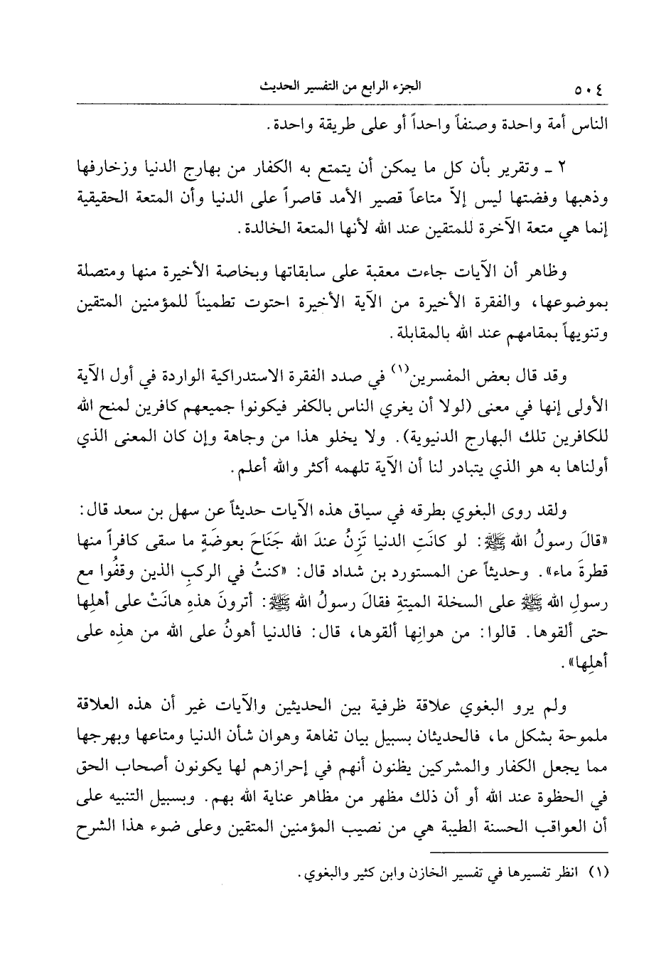 ولم يرو البغوي علاقة ظرفية بين الحديثين والآيات غير أن هذه العلاقة ملموحة بشكل ما، فالحديثان بسبيل بيان تفاهة وهوان شأن الدنيا ومتاعها وبهرجها مما يجعل الكفار والمشركين يظنون أنهم في إحرازهم لها يكونون أصحاب الحق في الحظوة عند الله أو أن ذلك مظهر من مظاهر عناية الله بهم. وبسبيل التنبيه على أن العواقب الحسنة الطيبة هي من نصيب المؤمنين المتقين وعلى ضوء هذا الشرح