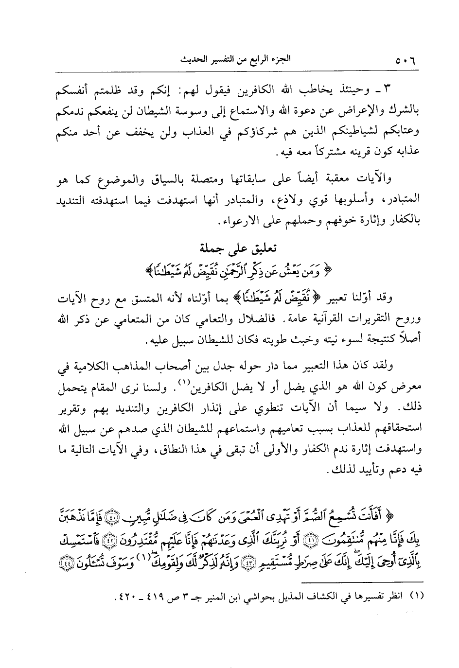 ولقد كان هذا التعبير مما دار حوله جدل بين أصحاب المذاهب الكلامية في معرض كون الله هو الذي يضل أو لا يضل الكافرين «1» . ولسنا نرى المقام يتحمل ذلك. ولا سيما أن الآيات تنطوي على إنذار الكافرين والتنديد بهم وتقرير استحقاقهم للعذاب بسبب تعاميهم واستماعهم للشيطان الذي صدهم عن سبيل الله واستهدفت إثارة ندم الكفار والأولى أن تبقى في هذا النطاق، وفي الآيات التالية ما فيه دعم وتأييد لذلك.