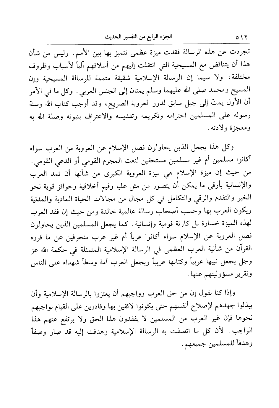 وإذا كنا نقول إن من حق العرب وواجبهم أن يعتزوا بالرسالة الإسلامية وأن يبذلوا جهدهم لإصلاح أنفسهم حتى يكونوا لائقين بها وقادرين على القيام بواجبهم نحوها فإن غير العرب من المسلمين لا يفقدون هذا الحق ولا يرتفع عنهم هذا الواجب. لأن كل ما اتصفت به الرسالة الإسلامية وهدفت إليه قد صار وصفا وهدفا للمسلمين جميعهم.