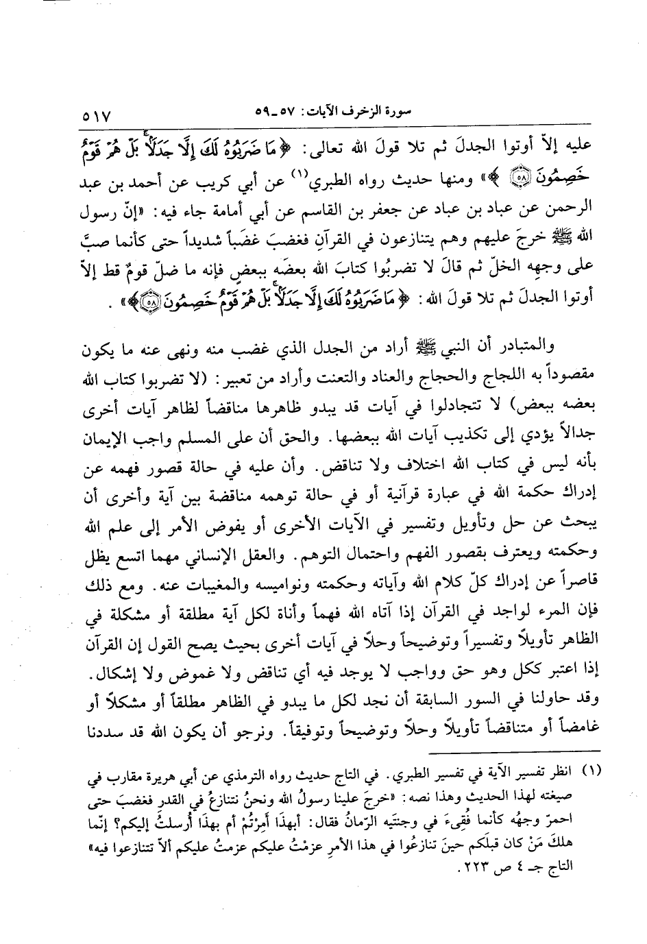 والمتبادر أن النبي صلى الله عليه وسلم أراد من الجدل الذي غضب منه ونهى عنه ما يكون مقصودا به اللجاج والحجاج والعناد والتعنت وأراد من تعبير: (لا تضربوا كتاب الله بعضه ببعض) لا تتجادلوا في آيات قد يبدو ظاهرها مناقضا لظاهر آيات أخرى جدالا يؤدي إلى تكذيب آيات الله ببعضها. والحق أن على المسلم واجب الإيمان بأنه ليس في كتاب الله اختلاف ولا تناقض. وأن عليه في حالة قصور فهمه عن إدراك حكمة الله في عبارة قرآنية أو في حالة توهمه مناقضة بين آية وأخرى أن يبحث عن حل وتأويل وتفسير في الآيات الأخرى أو يفوض الأمر إلى علم الله وحكمته ويعترف بقصور الفهم واحتمال التوهم. والعقل الإنساني مهما اتسع يظل قاصرا عن إدراك كلّ كلام الله وآياته وحكمته ونواميسه والمغيبات عنه. ومع ذلك فإن المرء لواجد في القرآن إذا آتاه الله فهما وأناة لكل آية مطلقة أو مشكلة في الظاهر تأويلا وتفسيرا وتوضيحا وحلا في آيات أخرى بحيث يصح القول إن القرآن إذا اعتبر ككل وهو حق وواجب لا يوجد فيه أي تناقض ولا غموض ولا إشكال.