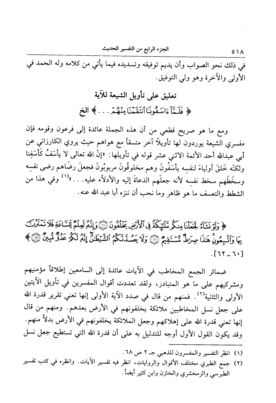 ومع ما هو صريح قطعي من أن هذه الجملة عائدة إلى فرعون وقومه فإن مفسري الشيعة يوردون لها تأويلا آخر متسقا مع هواهم حيث يروي الكارزاني عن أبي عبد الله أحد الأئمة الاثني عشر قوله في تأويلها: «إنّ الله تعالى لا يأسف كأسفنا ولكنّه خلق أولياء لنفسه يأسفون وهم مخلوقون مربوبون فجعل رضاهم رضى نفسه وسخطهم سخط نفسه لأنه جعلهم الدعاة إليه والأدلّاء عليه ... » «1» وفي هذا من الشطط والتعسف ما هو ظاهر وما نحب أن ننزه أبا عبد الله عنه.