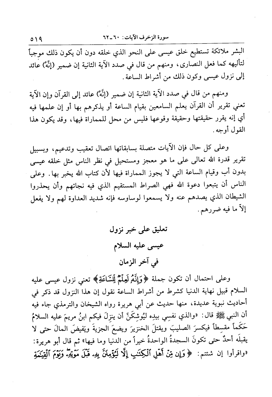 وعلى احتمال أن تكون جملة وَإِنَّهُ لَعِلْمٌ لِلسَّاعَةِ تعني نزول عيسى عليه السلام قبيل نهاية الدنيا كشرط من أشراط الساعة نقول إن هذا النزول قد ذكر في أحاديث نبوية عديدة، منها حديث عن أبي هريرة رواه الشيخان والترمذي جاء فيه أن النبي صلى الله عليه وسلم قال: «والذي نفسي بيده ليوشكنّ أن ينزل فيكم ابن مريم عليه السلام حكما مقسطا فيكسر الصليب ويقتل الخنزير ويضع الجزية ويفيض المال حتى لا يقبله أحد حتى تكون السجدة الواحدة خيرا من الدنيا وما فيها» ثم قال أبو هريرة: