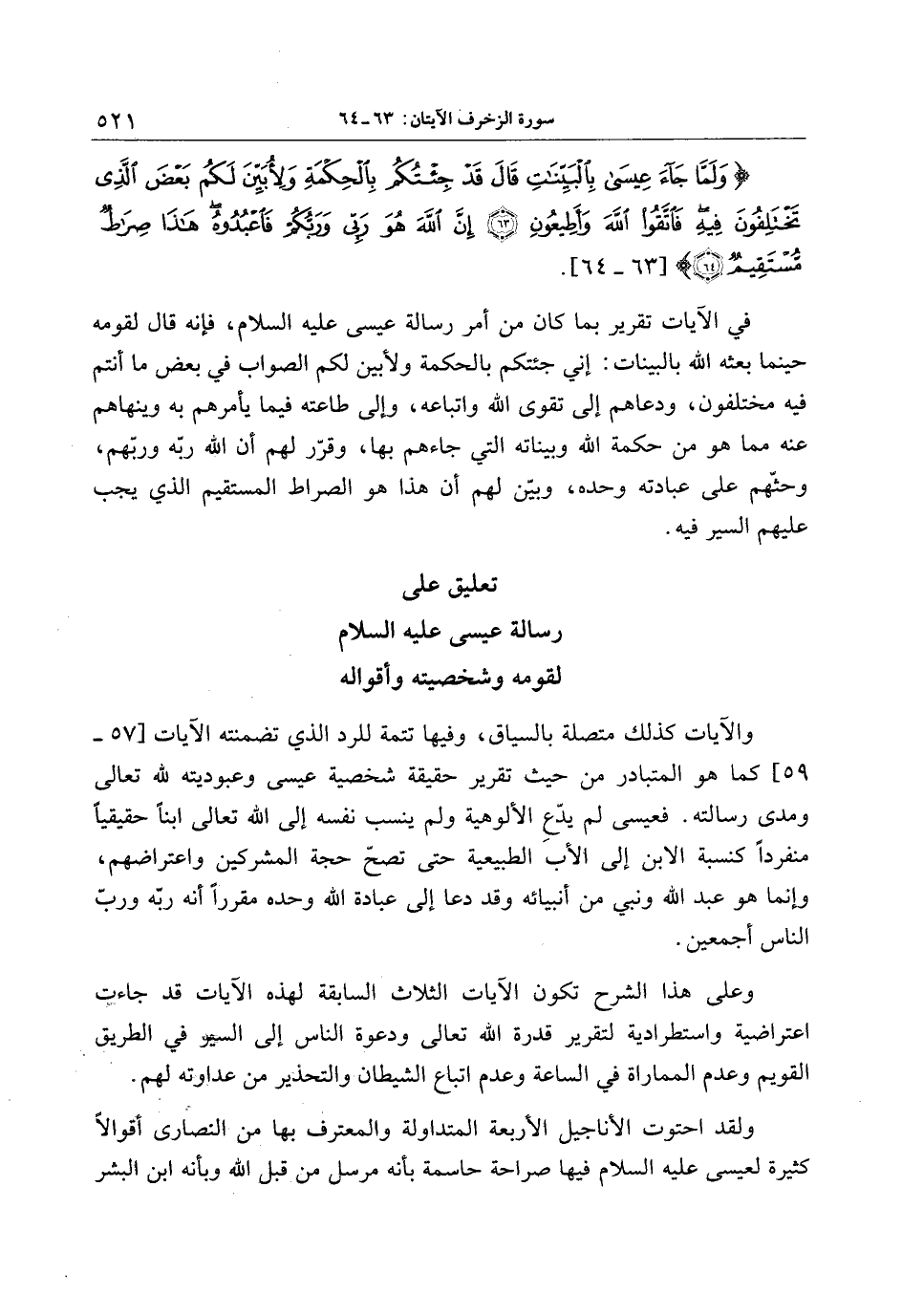 . في الآيات تقرير بما كان من أمر رسالة عيسى عليه السلام، فإنه قال لقومه حينما بعثه الله بالبينات: إني جئتكم بالحكمة ولأبين لكم الصواب في بعض ما أنتم فيه مختلفون، ودعاهم إلى تقوى الله واتباعه، وإلى طاعته فيما يأمرهم به وينهاهم عنه مما هو من حكمة الله وبيناته التي جاءهم بها، وقرّر لهم أن الله ربّه وربّهم، وحثّهم على عبادته وحده، وبيّن لهم أن هذا هو الصراط المستقيم الذي يجب عليهم السير فيه.