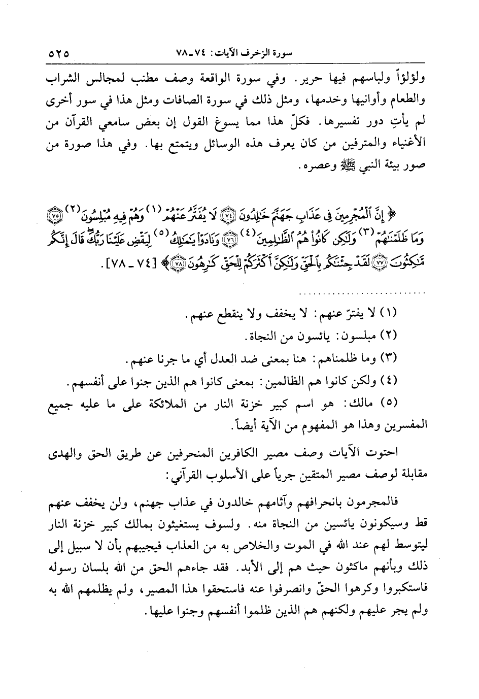 إِنَّ الْمُجْرِمِينَ فِي عَذابِ جَهَنَّمَ خالِدُونَ (74) لا يُفَتَّرُ عَنْهُمْ وَهُمْ فِيهِ مُبْلِسُونَ (75) وَما ظَلَمْناهُمْ وَلكِنْ كانُوا هُمُ الظَّالِمِينَ (76) وَنادَوْا يا مالِكُ لِيَقْضِ عَلَيْنا رَبُّكَ قالَ إِنَّكُمْ ماكِثُونَ (77) لَقَدْ جِئْناكُمْ بِالْحَقِّ وَلكِنَّ أَكْثَرَكُمْ لِلْحَقِّ كارِهُونَ (78)