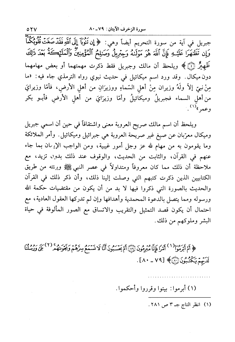 جبريل في آية من سورة التحريم أيضا وهي: إِنْ تَتُوبا إِلَى اللَّهِ فَقَدْ صَغَتْ قُلُوبُكُما وَإِنْ تَظاهَرا عَلَيْهِ فَإِنَّ اللَّهَ هُوَ مَوْلاهُ وَجِبْرِيلُ وَصالِحُ الْمُؤْمِنِينَ وَالْمَلائِكَةُ بَعْدَ ذلِكَ ظَهِيرٌ (4) ويلحظ أن مالك وجبريل فقط ذكرت مهمتهما أو بعض مهامهما دون ميكال. وقد ورد اسم ميكائيل في حديث نبوي رواه الترمذي جاء فيه: «ما من نبيّ إلّا وله وزيران من أهل السّماء ووزيران من أهل الأرض، فأمّا وزيراي من أهل السماء فجبريل وميكائيل وأمّا وزيراي من أهل الأرض فأبو بكر وعمر» «1» .