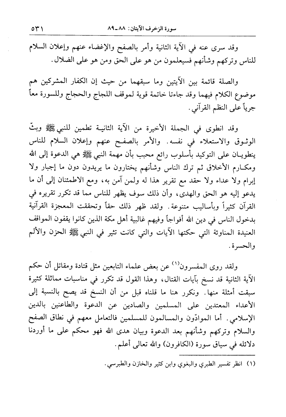 ولقد روى المفسرون «1» عن بعض علماء التابعين مثل قتادة ومقاتل أن حكم الآية الثانية قد نسخ بآيات القتال، وهذا القول قد تكرر في مناسبات مماثلة كثيرة سبقت أمثلة منها. ونكرر هنا ما قلناه قبل من أن النسخ قد يصح بالنسبة إلى الأعداء المعتدين على المسلمين والصادين عن الدعوة والطاعنين بالدين الإسلامي. أما الموادّون والمسالمون للمسلمين فالتعامل معهم في نطاق الصفح والسلام وتركهم وشأنهم بعد الدعوة وبيان هدى الله فهو محكم على ما أوردنا دلائله في سياق سورة (الكافرون) والله تعالى أعلم.