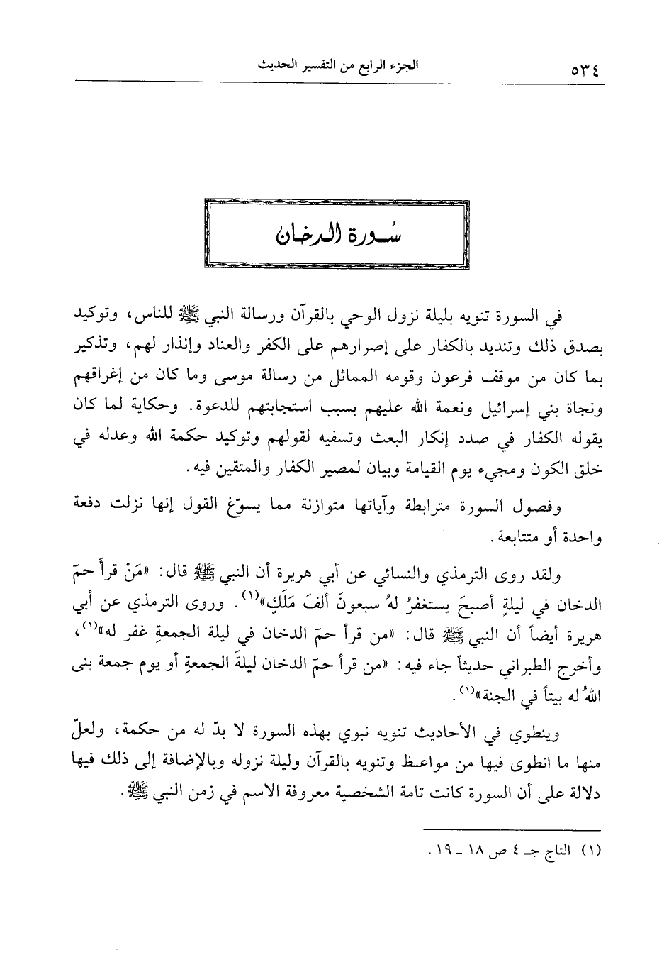 ولقد روى الترمذي والنسائي عن أبي هريرة أن النبي صلى الله عليه وسلم قال: «من قرأ حم الدخان في ليلة أصبح يستغفر له سبعون ألف ملك» «1» . وروى الترمذي عن أبي هريرة أيضا أن النبي صلى الله عليه وسلم قال: «من قرأ حم الدخان في ليلة الجمعة غفر له» «2» ، وأخرج الطبراني حديثا جاء فيه: «من قرأ حم الدخان ليلة الجمعة أو يوم جمعة بنى الله له بيتا في الجنة» «3» .