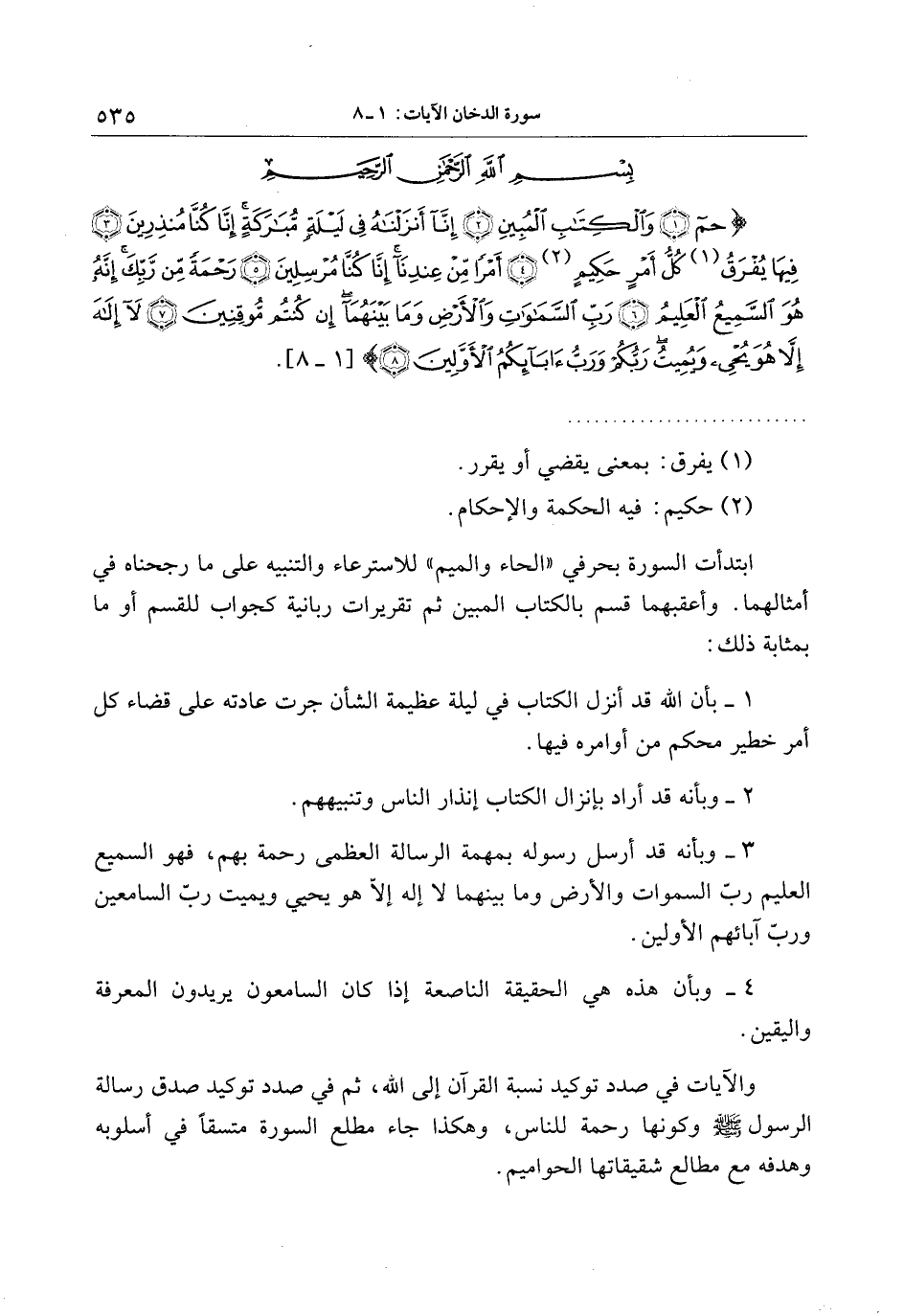 حم (1) وَالْكِتابِ الْمُبِينِ (2) إِنَّا أَنْزَلْناهُ فِي لَيْلَةٍ مُبارَكَةٍ إِنَّا كُنَّا مُنْذِرِينَ (3) فِيها يُفْرَقُ كُلُّ أَمْرٍ حَكِيمٍ (4)