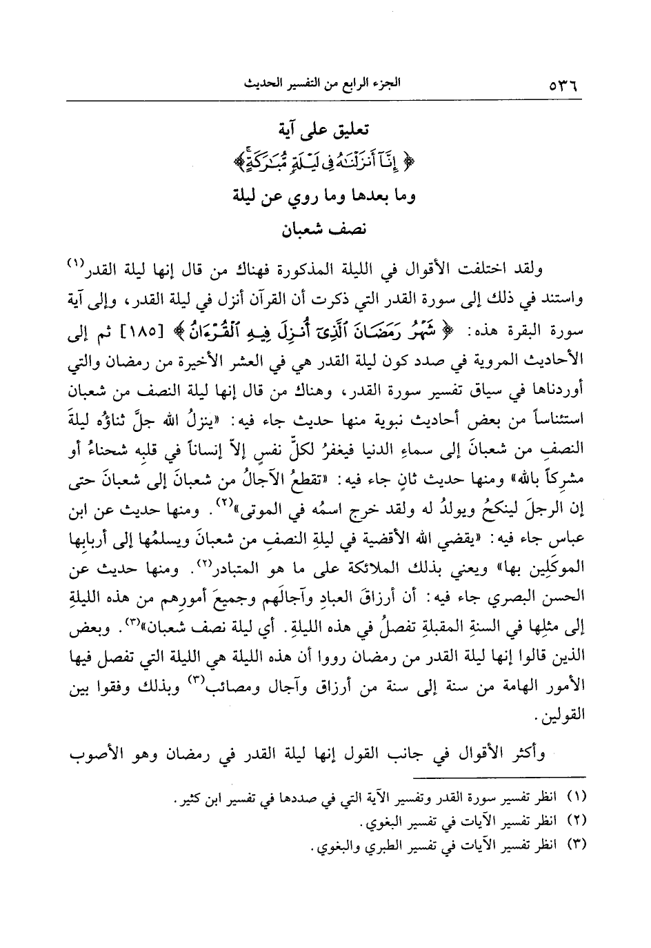 تعليق على آية إِنَّا أَنْزَلْناهُ فِي لَيْلَةٍ مُبارَكَةٍ وما بعدها وما روي عن ليلة نصف شعبان