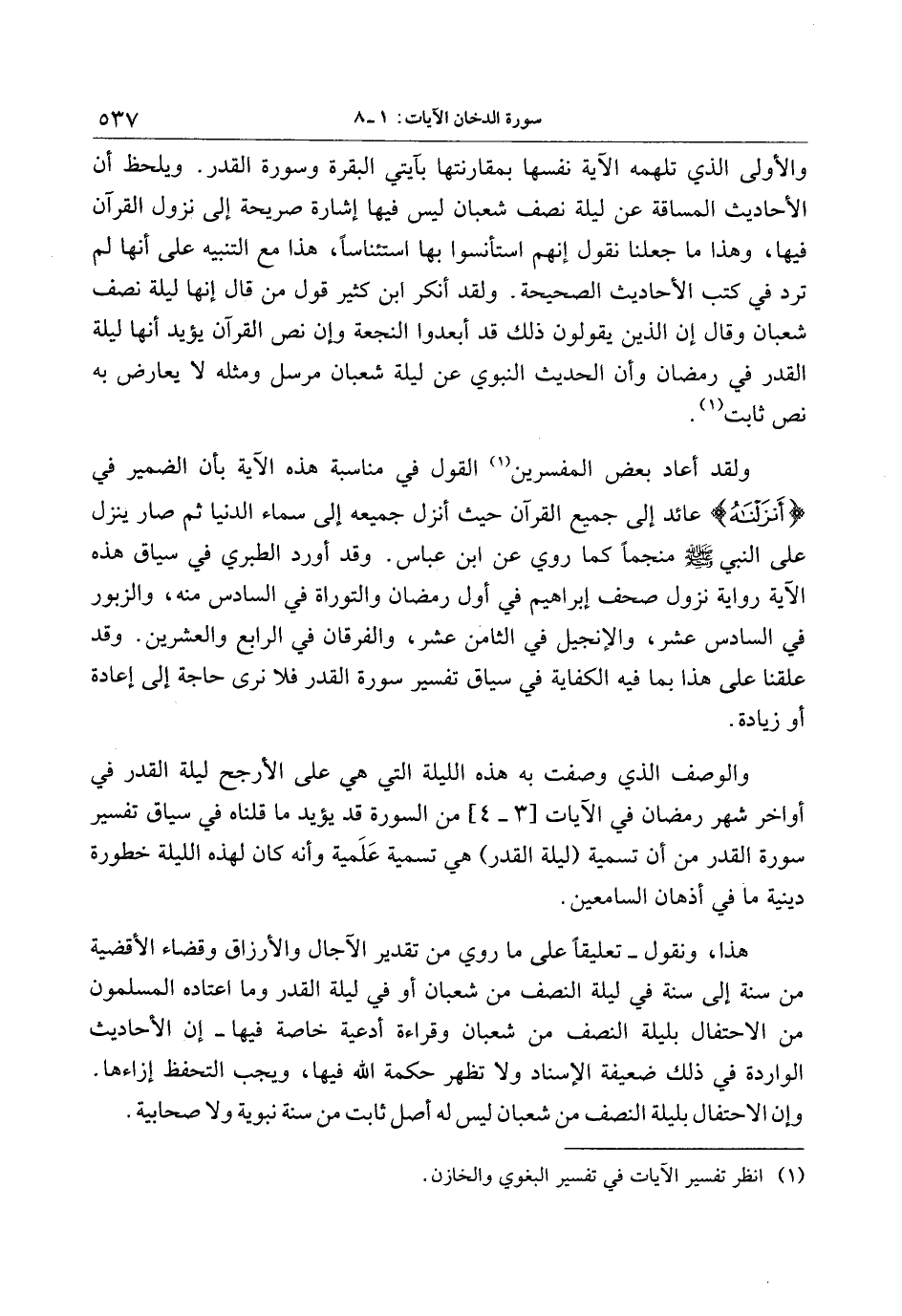 والأولى الذي تلهمه الآية نفسها بمقارنتها بآيتي البقرة وسورة القدر. ويلحظ أن الأحاديث المساقة عن ليلة نصف شعبان ليس فيها إشارة صريحة إلى نزول القرآن فيها، وهذا ما جعلنا نقول إنهم استأنسوا بها استئناسا، هذا مع التنبيه على أنها لم ترد في كتب الأحاديث الصحيحة. ولقد أنكر ابن كثير قول من قال إنها ليلة نصف شعبان وقال إن الذين يقولون ذلك قد أبعدوا النجعة وإن نص القرآن يؤيد أنها ليلة القدر في رمضان وأن الحديث النبوي عن ليلة شعبان مرسل ومثله لا يعارض به نص ثابت «1» .