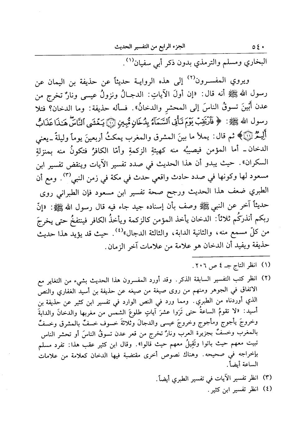 (2) انظر كتب التفسير السابقة الذكر. وقد أورد المفسرون هذا الحديث بشيء من التغاير مع الاتفاق في الجوهر ومنهم من روى صيغة من صيغة عن حذيفة بن أسيد الغفاري والنص الذي أوردناه من الطبري. ومما ورد في النص الوارد في تفسير ابن كثير عن حذيفة بن أسيد: «لا تقوم الساعة حتى تروا عشر آيات طلوع الشمس من مغربها والدخان والدابة وخروج يأجوج ومأجوج وخروج عيسى والدجال وثلاثة خسوف خسف بالمشرق وخسف بالمغرب وخسف بجزيرة العرب ونار تخرج من قعر عدن تسوق الناس أو تحشر الناس تبيت معهم حيث باتوا وتقيل معهم حيث قالوا» . وقال ابن كثير عقب هذا: تفرد مسلم بإخراجه في صحيحه. وهناك نصوص أخرى مقتضبة فيها الدخان كعلامة من علامات الساعة أيضا.