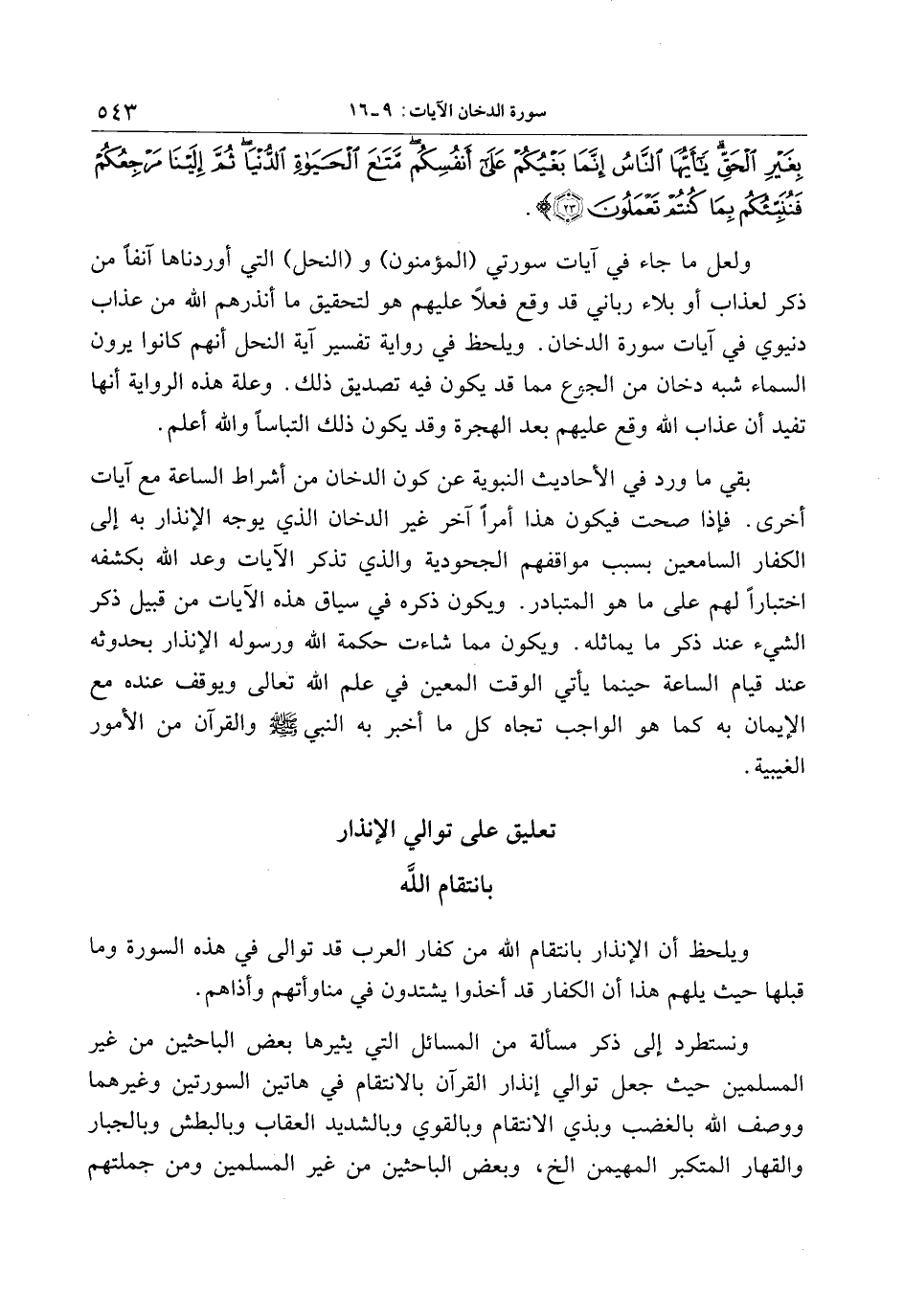 ونستطرد إلى ذكر مسألة من المسائل التي يثيرها بعض الباحثين من غير المسلمين حيث جعل توالي إنذار القرآن بالانتقام في هاتين السورتين وغيرهما ووصف الله بالغضب وبذي الانتقام وبالقوي وبالشديد العقاب وبالبطش وبالجبار والقهار المتكبر المهيمن إلخ، وبعض الباحثين من غير المسلمين ومن جملتهم