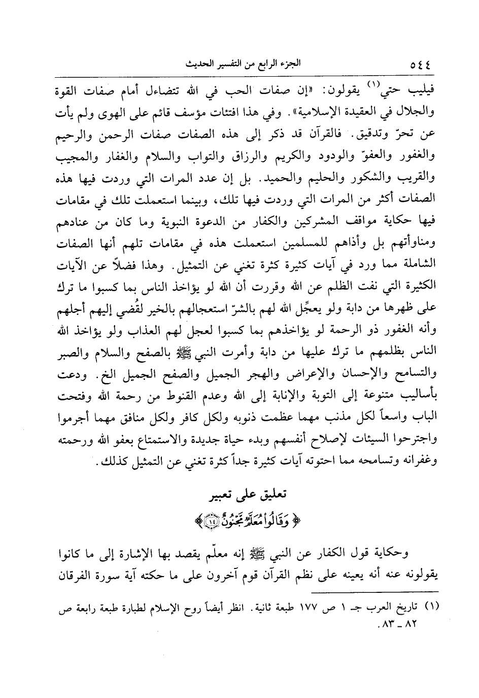 فيليب حتي «1» يقولون: «إن صفات الحب في الله تتضاءل أمام صفات القوة والجلال في العقيدة الإسلامية» . وفي هذا افتئات مؤسف قائم على الهوى ولم يأت عن تحرّ وتدقيق. فالقرآن قد ذكر إلى هذه الصفات صفات الرحمن والرحيم والغفور والعفوّ والودود والكريم والرزاق والتواب والسلام والغفار والمجيب والقريب والشكور والحليم والحميد. بل إن عدد المرات التي وردت فيها هذه الصفات أكثر من المرات التي وردت فيها تلك، وبينما استعملت تلك في مقامات فيها حكاية مواقف المشركين والكفار من الدعوة النبوية وما كان من عنادهم ومناوأتهم بل وأذاهم للمسلمين استعملت هذه في مقامات تلهم أنها الصفات الشاملة مما ورد في آيات كثيرة كثرة تغني عن التمثيل. وهذا فضلا عن الآيات الكثيرة التي نفت الظلم عن الله وقررت أن الله لو يؤاخذ الناس بما كسبوا ما ترك على ظهرها من دابة ولو يعجّل الله لهم بالشرّ استعجالهم بالخير لقضي إليهم أجلهم وأنه الغفور ذو الرحمة لو يؤاخذهم بما كسبوا لعجل لهم العذاب ولو يؤاخذ الله الناس بظلمهم ما ترك عليها من دابة وأمرت النبي صلى الله عليه وسلم بالصفح والسلام والصبر والتسامح والإحسان والإعراض والهجر الجميل والصفح الجميل إلخ. ودعت بأساليب متنوعة إلى التوبة والإنابة إلى الله وعدم القنوط من رحمة الله وفتحت الباب واسعا لكل مذنب مهما عظمت ذنوبه ولكل كافر ولكل منافق مهما أجرموا واجترحوا السيئات لإصلاح أنفسهم وبدء حياة جديدة والاستمتاع بعفو الله ورحمته وغفرانه وتسامحه مما احتوته آيات كثيرة جدا كثرة تغني عن التمثيل كذلك.
