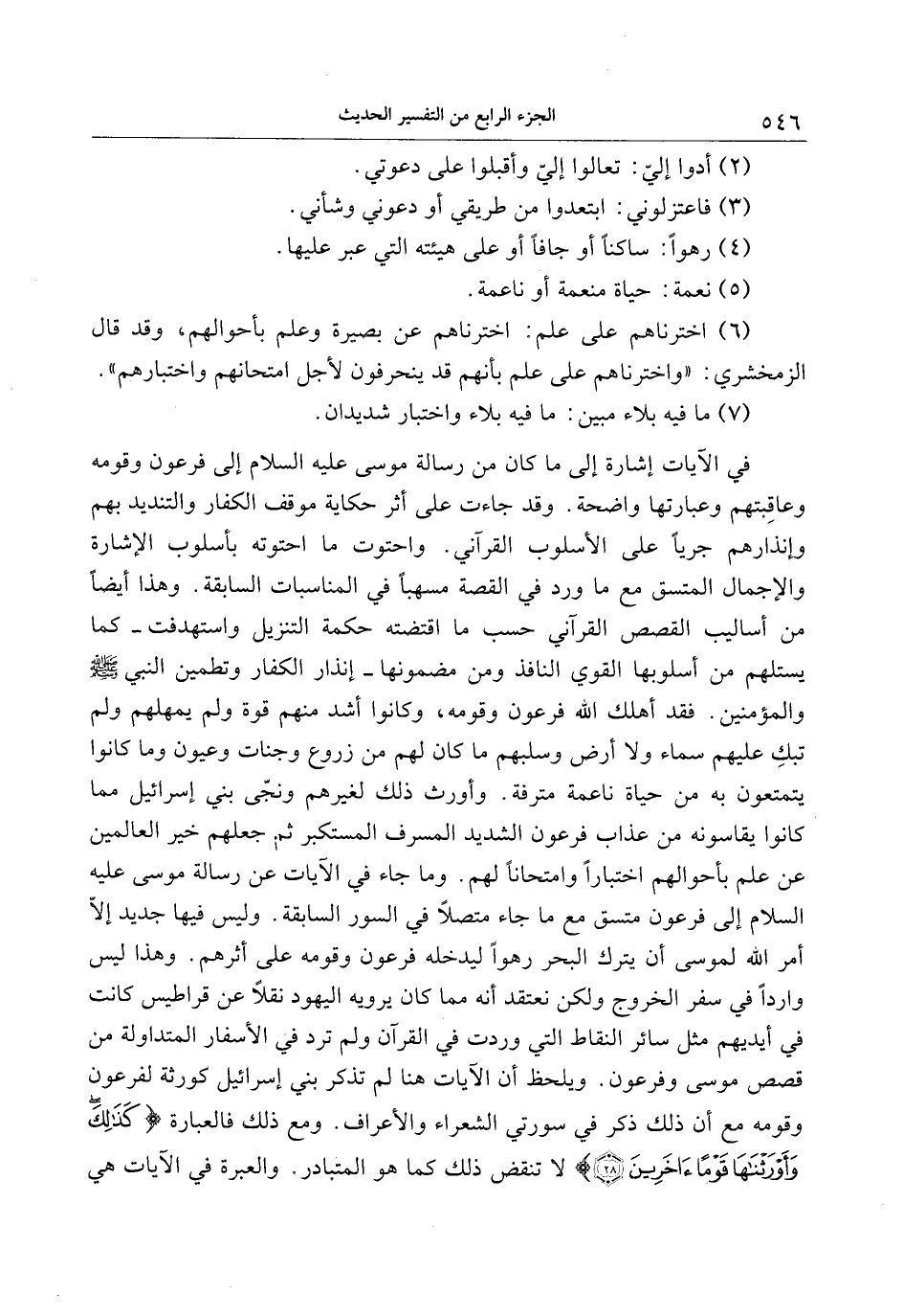 في الآيات إشارة إلى ما كان من رسالة موسى عليه السلام إلى فرعون وقومه وعاقبتهم وعبارتها واضحة. وقد جاءت على أثر حكاية موقف الكفار والتنديد بهم وإنذارهم جريا على الأسلوب القرآني. واحتوت ما احتوته بأسلوب الإشارة والإجمال المتسق مع ما ورد في القصة مسهبا في المناسبات السابقة. وهذا أيضا من أساليب القصص القرآني حسب ما اقتضته حكمة التنزيل واستهدفت- كما يستلهم من أسلوبها القوي النافذ ومن مضمونها- إنذار الكفار وتطمين النبي صلى الله عليه وسلم والمؤمنين. فقد أهلك الله فرعون وقومه، وكانوا أشد منهم قوة ولم يمهلهم ولم تبك عليهم سماء ولا أرض وسلبهم ما كان لهم من زروع وجنات وعيون وما كانوا يتمتعون به من حياة ناعمة مترفة. وأورث ذلك لغيرهم ونجّى بني إسرائيل مما كانوا يقاسونه من عذاب فرعون الشديد المسرف المستكبر ثم جعلهم خير العالمين عن علم بأحوالهم اختبارا وامتحانا لهم. وما جاء في الآيات عن رسالة موسى عليه السلام إلى فرعون متسق مع ما جاء متصلا في السور السابقة. وليس فيها جديد إلّا أمر الله لموسى أن يترك البحر رهوا ليدخله فرعون وقومه على أثرهم. وهذا ليس واردا في سفر الخروج ولكن نعتقد أنه مما كان يرويه اليهود نقلا عن قراطيس كانت في أيديهم مثل سائر النقاط التي وردت في القرآن ولم ترد في الأسفار المتداولة من قصص موسى وفرعون. ويلحظ أن الآيات هنا لم تذكر بني إسرائيل كورثة لفرعون وقومه مع أن ذلك ذكر في سورتي الشعراء والأعراف. ومع ذلك فالعبارة كَذلِكَ وَأَوْرَثْناها قَوْماً آخَرِينَ (28) لا تنقض ذلك كما هو المتبادر. والعبرة في الآيات هي