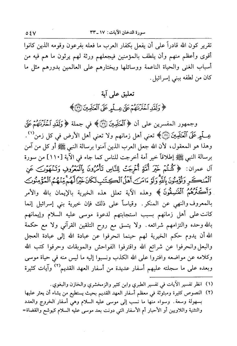 وجمهور المفسرين على أن الْعالَمِينَ (32) في جملة وَلَقَدِ اخْتَرْناهُمْ عَلى عِلْمٍ عَلَى الْعالَمِينَ (32) تعني أهل زمانهم ولا تعني أهل الأرض في كل زمن «1» .
