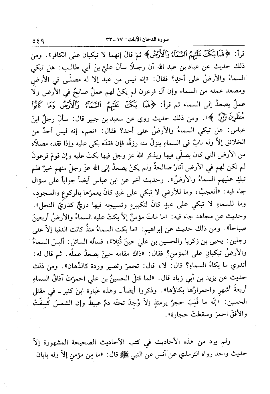 قرأ: فَما بَكَتْ عَلَيْهِمُ السَّماءُ وَالْأَرْضُ ثمّ قال إنهما لا تبكيان على الكافر» . ومن ذلك حديث عن عباد بن عبد الله أن رجلا سأل عليّ بن أبي طالب: هل تبكي السماء والأرض على أحد؟ فقال: «إنه ليس من عبد إلا له مصلّى في الأرض ومصعد عمله من السماء وإن آل فرعون لم يكن لهم عمل صالح في الأرض ولا عمل يصعد إلى السماء ثم قرأ: فَما بَكَتْ عَلَيْهِمُ السَّماءُ وَالْأَرْضُ وَما كانُوا مُنْظَرِينَ (29) » . ومن ذلك حديث روي عن سعيد بن جبير قال: سأل رجل ابن عباس: هل تبكي السماء والأرض على أحد؟ فقال: «نعم، إنه ليس أحد من الخلائق إلّا وله باب في السماء ينزل منه رزقه فإن فقده بكى عليه وإذا فقده مصلّاه من الأرض التي كان يصلّي فيها ويذكر الله عز وجل فيها بكت عليه وإن قوم فرعون لم تكن لهم في الأرض آثار صالحة ولم يكن يصعد إلى الله عزّ وجلّ منهم خير فلم تبك عليهم السماء والأرض» . وحديث آخر عن ابن عباس أيضا جوابا على سؤال جاء فيه: «أتعجب، وما للأرض لا تبكي على عبد كان يعمرها بالركوع والسجود، وما للسماء لا تبكي على عبد كان لتكبيره وتسبيحه فيها دويّ كدويّ النحل» .