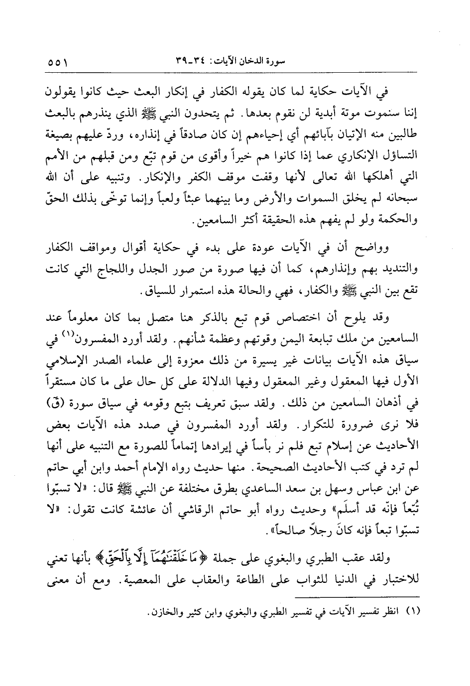 ولقد عقب الطبري والبغوي على جملة ما خَلَقْناهُما إِلَّا بِالْحَقِّ بأنها تعني للاختبار في الدنيا للثواب على الطاعة والعقاب على المعصية. ومع أن معنى
