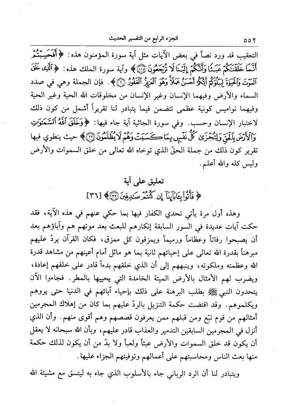 التعقيب قد ورد نصا في بعض الآيات مثل آية سورة المؤمنون هذه: أَفَحَسِبْتُمْ أَنَّما خَلَقْناكُمْ عَبَثاً وَأَنَّكُمْ إِلَيْنا لا تُرْجَعُونَ (115) وآية سورة الملك هذه: الَّذِي خَلَقَ الْمَوْتَ وَالْحَياةَ لِيَبْلُوَكُمْ أَيُّكُمْ أَحْسَنُ عَمَلًا وَهُوَ الْعَزِيزُ الْغَفُورُ (2) . فإن الجملة وهي في صدد السماء والأرض وفيهما الإنسان وغير الإنسان من مخلوقات الله الحية وغير الحية وفيهما نواميس كونية عظمى تتضمن فيما يتبادر لنا تقريرا أشمل من كون ذلك لاختبار الإنسان وحسب. وفي سورة الجاثية آية جاء فيها: وَخَلَقَ اللَّهُ السَّماواتِ وَالْأَرْضَ بِالْحَقِّ وَلِتُجْزى كُلُّ نَفْسٍ بِما كَسَبَتْ وَهُمْ لا يُظْلَمُونَ (22) حيث ينطوي فيها تقرير كون ذلك من جملة الحقّ الذي توخاه الله تعالى من خلق السموات والأرض وليس كله والله أعلم.