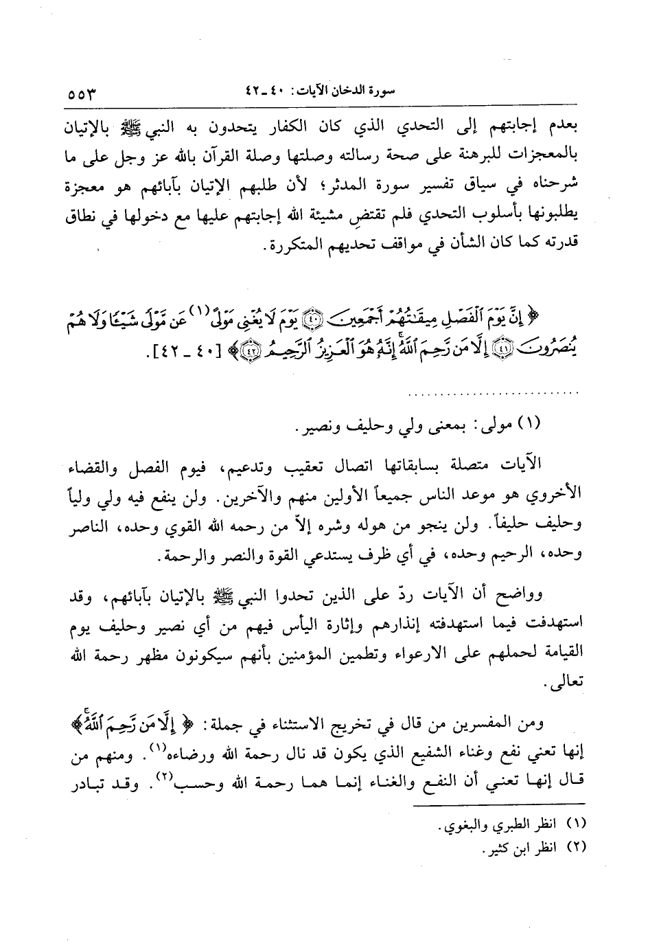 إِنَّ يَوْمَ الْفَصْلِ مِيقاتُهُمْ أَجْمَعِينَ (40) يَوْمَ لا يُغْنِي مَوْلًى عَنْ مَوْلًى شَيْئاً وَلا هُمْ يُنْصَرُونَ (41) إِلاَّ مَنْ رَحِمَ اللَّهُ إِنَّهُ هُوَ الْعَزِيزُ الرَّحِيمُ (42)