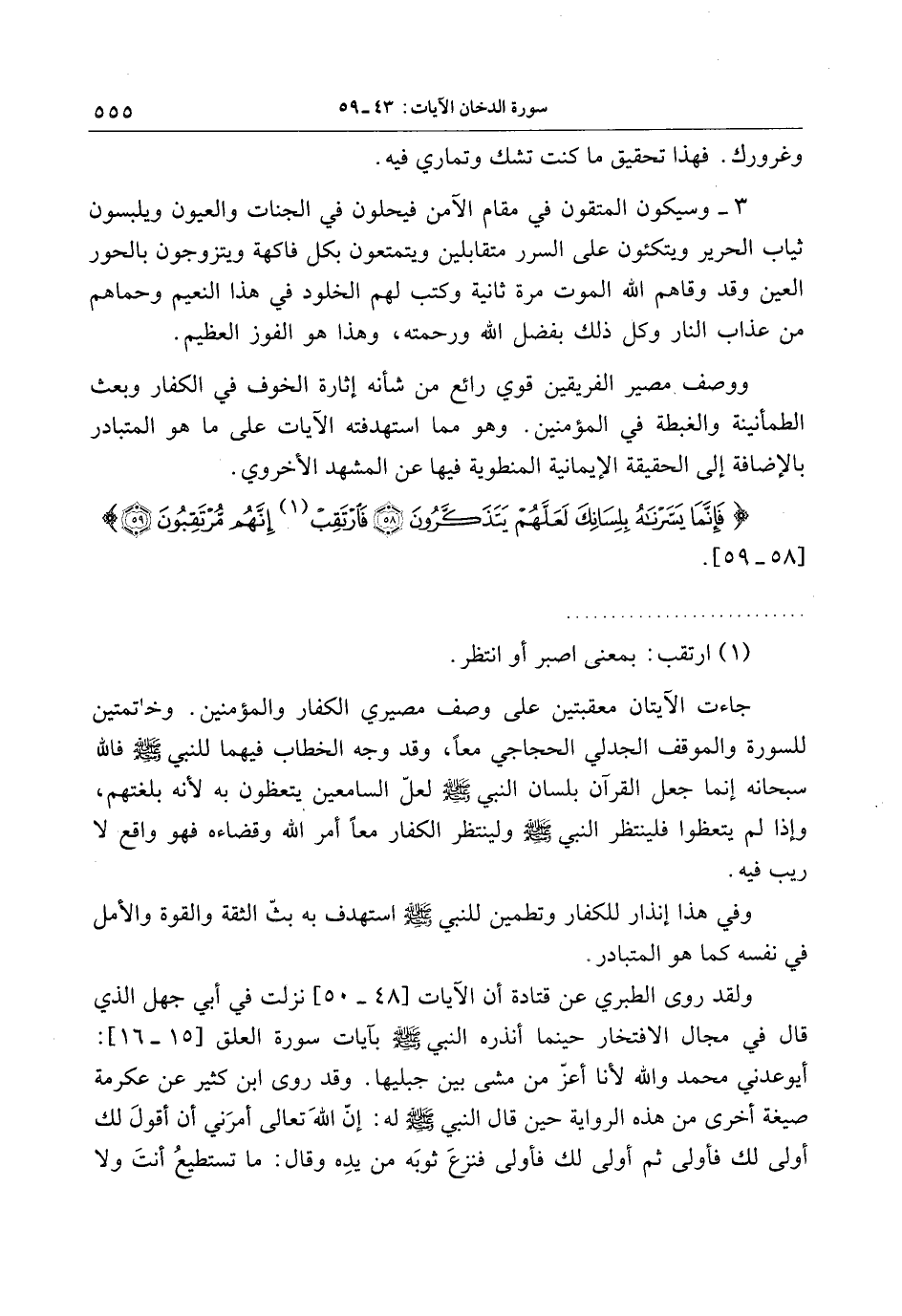 جاءت الآيتان معقبتين على وصف مصيري الكفار والمؤمنين. وخاتمتين للسورة والموقف الجدلي الحجاجي معا، وقد وجه الخطاب فيهما للنبي صلى الله عليه وسلم فالله سبحانه إنما جعل القرآن بلسان النبي صلى الله عليه وسلم لعلّ السامعين يتعظون به لأنه بلغتهم، وإذا لم يتعظوا فلينتظر النبي صلى الله عليه وسلم ولينتظر الكفار معا أمر الله وقضاءه فهو واقع لا ريب فيه.