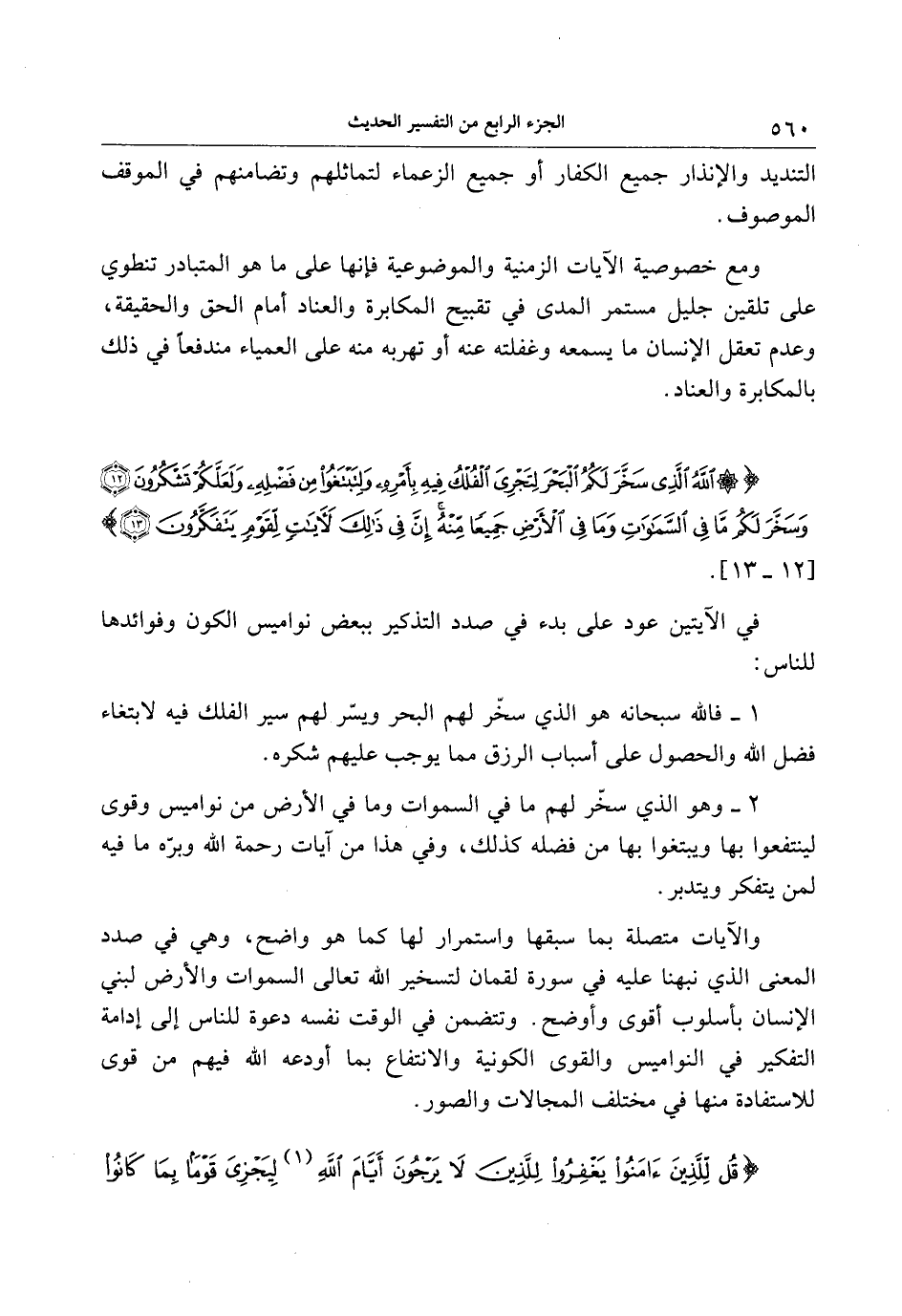 والآيات متصلة بما سبقها واستمرار لها كما هو واضح، وهي في صدد المعنى الذي نبهنا عليه في سورة لقمان لتسخير الله تعالى السموات والأرض لبني الإنسان بأسلوب أقوى وأوضح. وتتضمن في الوقت نفسه دعوة للناس إلى إدامة التفكير في النواميس والقوى الكونية والانتفاع بما أودعه الله فيهم من قوى للاستفادة منها في مختلف المجالات والصور.