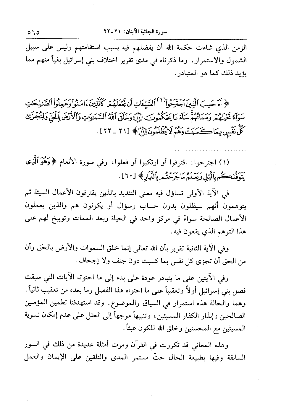 أَمْ حَسِبَ الَّذِينَ اجْتَرَحُوا السَّيِّئاتِ أَنْ نَجْعَلَهُمْ كَالَّذِينَ آمَنُوا وَعَمِلُوا الصَّالِحاتِ سَواءً مَحْياهُمْ وَمَماتُهُمْ ساءَ ما يَحْكُمُونَ (21) وَخَلَقَ اللَّهُ السَّماواتِ وَالْأَرْضَ بِالْحَقِّ وَلِتُجْزى كُلُّ نَفْسٍ بِما كَسَبَتْ وَهُمْ لا يُظْلَمُونَ (22)