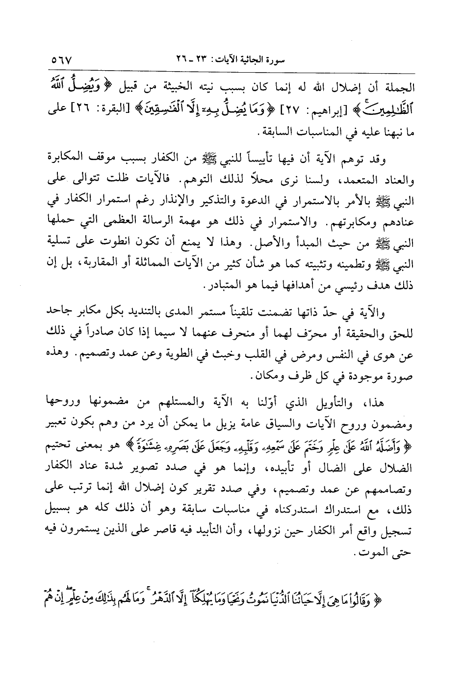 هذا، والتأويل الذي أوّلنا به الآية والمستلهم من مضمونها وروحها ومضمون وروح الآيات والسياق عامة يزيل ما يمكن أن يرد من وهم بكون تعبير وَأَضَلَّهُ اللَّهُ عَلى عِلْمٍ وَخَتَمَ عَلى سَمْعِهِ وَقَلْبِهِ وَجَعَلَ عَلى بَصَرِهِ غِشاوَةً هو بمعنى تحتيم الضلال على الضال أو تأبيده، وإنما هو في صدد تصوير شدة عناد الكفار وتصاممهم عن عمد وتصميم، وفي صدد تقرير كون إضلال الله إنما ترتب على ذلك، مع استدراك استدركناه في مناسبات سابقة وهو أن ذلك كله هو بسبيل تسجيل واقع أمر الكفار حين نزولها، وأن التأبيد فيه قاصر على الذين يستمرون فيه حتى الموت.