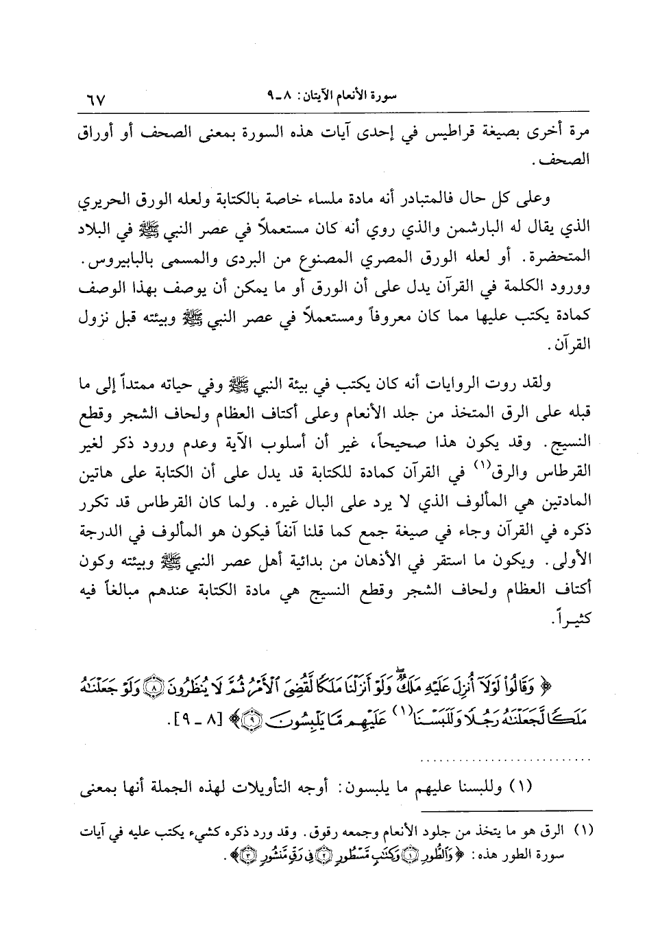 ولقد روت الروايات أنه كان يكتب في بيئة النبي صلى الله عليه وسلم وفي حياته ممتدا إلى ما قبله على الرق المتخذ من جلد الأنعام وعلى أكتاف العظام ولحاف الشجر وقطع النسيج. وقد يكون هذا صحيحا، غير أن أسلوب الآية وعدم ورود ذكر لغير القرطاس والرق «1» في القرآن كمادة للكتابة قد يدل على أن الكتابة على هاتين المادتين هي المألوف الذي لا يرد على البال غيره. ولما كان القرطاس قد تكرر ذكره في القرآن وجاء في صيغة جمع كما قلنا آنفا فيكون هو المألوف في الدرجة الأولى. ويكون ما استقر في الأذهان من بدائية أهل عصر النبي صلى الله عليه وسلم وبيئته وكون أكتاف العظام ولحاف الشجر وقطع النسيج هي مادة الكتابة عندهم مبالغا فيه كثيرا.