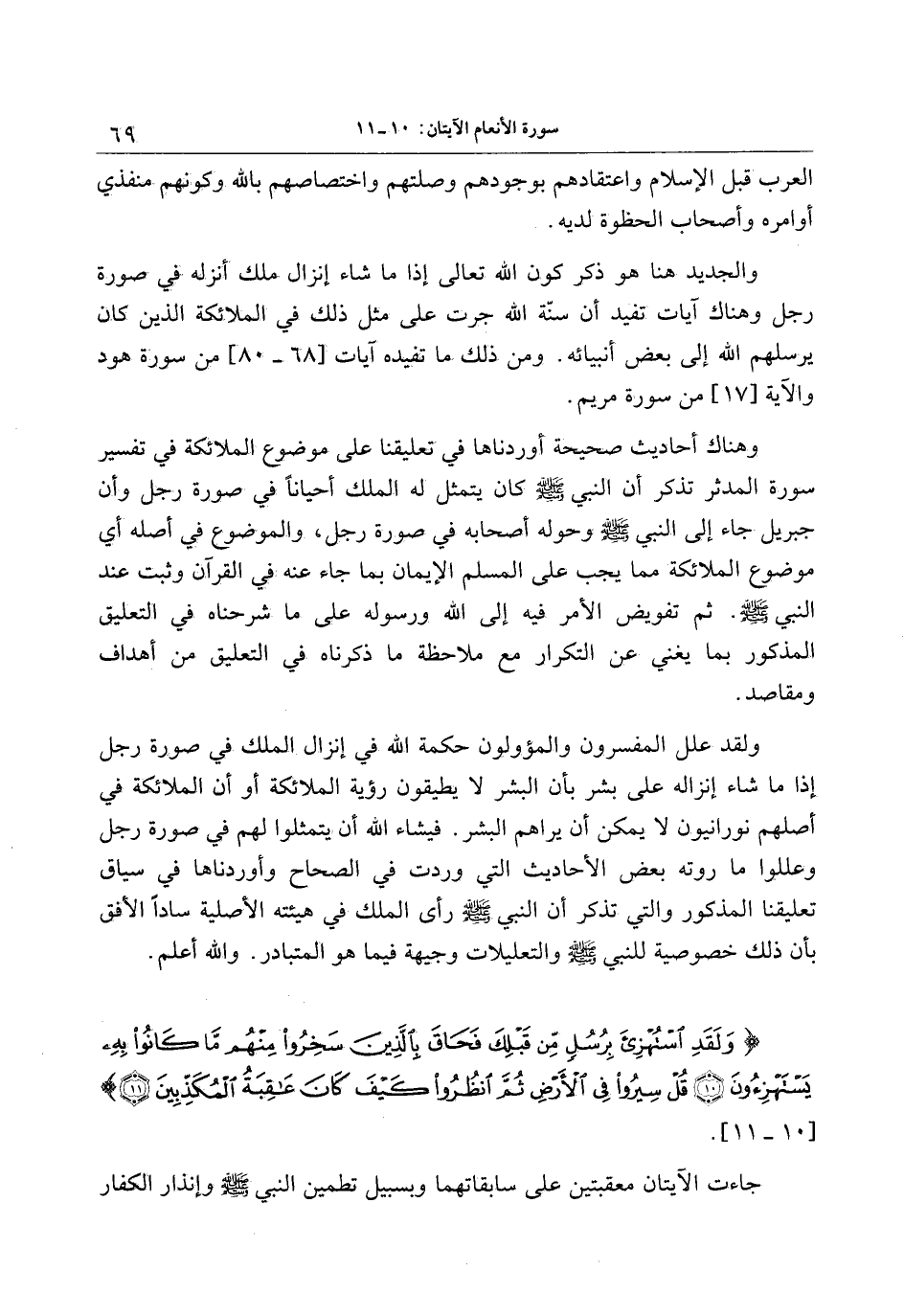 والجديد هنا هو ذكر كون الله تعالى إذا ما شاء إنزال ملك أنزله في صورة رجل وهناك آيات تفيد أن سنّة الله جرت على مثل ذلك في الملائكة الذين كان يرسلهم الله إلى بعض أنبيائه. ومن ذلك ما تفيده آيات [68- 80] من سورة هود والآية [17] من سورة مريم.