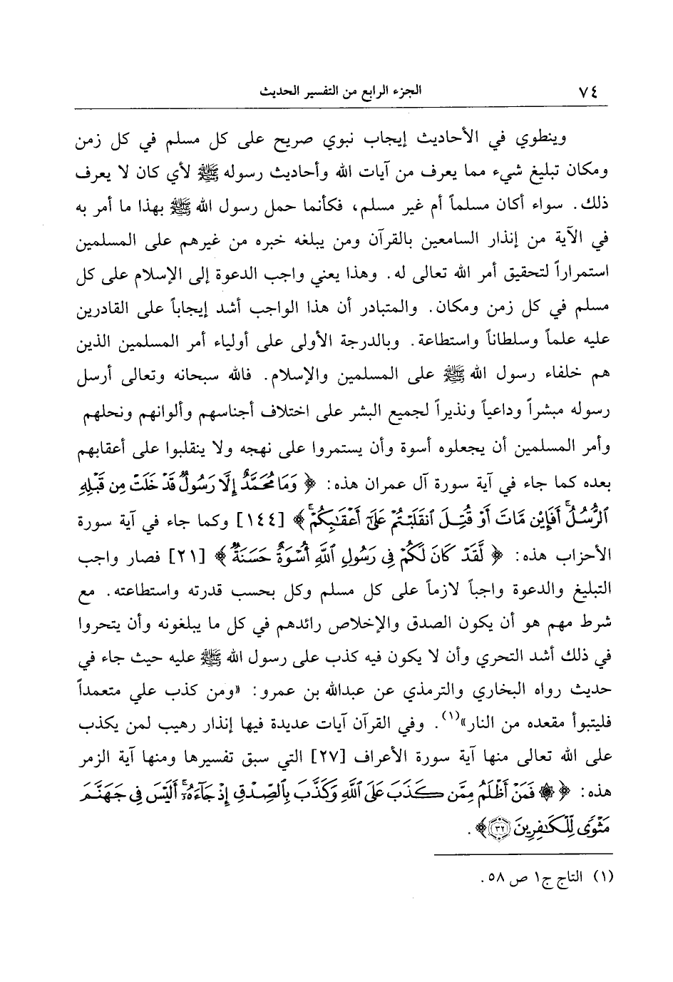 وينطوي في الأحاديث إيجاب نبوي صريح على كل مسلم في كل زمن ومكان تبليغ شيء مما يعرف من آيات الله وأحاديث رسوله صلى الله عليه وسلم لأي كان لا يعرف ذلك. سواء أكان مسلما أم غير مسلم، فكأنما حمل رسول الله صلى الله عليه وسلم بهذا ما أمر به في الآية من إنذار السامعين بالقرآن ومن يبلغه خبره من غيرهم على المسلمين استمرارا لتحقيق أمر الله تعالى له. وهذا يعني واجب الدعوة إلى الإسلام على كل مسلم في كل زمن ومكان. والمتبادر أن هذا الواجب أشد إيجابا على القادرين عليه علما وسلطانا واستطاعة. وبالدرجة الأولى على أولياء أمر المسلمين الذين هم خلفاء رسول الله صلى الله عليه وسلم على المسلمين والإسلام. فالله سبحانه وتعالى أرسل رسوله مبشرا وداعيا ونذيرا لجميع البشر على اختلاف أجناسهم وألوانهم ونحلهم وأمر المسلمين أن يجعلوه أسوة وأن يستمروا على نهجه ولا ينقلبوا على أعقابهم بعده كما جاء في آية سورة آل عمران هذه: وَما مُحَمَّدٌ إِلَّا رَسُولٌ قَدْ خَلَتْ مِنْ قَبْلِهِ الرُّسُلُ أَفَإِنْ ماتَ أَوْ قُتِلَ انْقَلَبْتُمْ عَلى أَعْقابِكُمْ [144] وكما جاء في آية سورة الأحزاب هذه: لَقَدْ كانَ لَكُمْ فِي رَسُولِ اللَّهِ أُسْوَةٌ حَسَنَةٌ [21] فصار واجب التبليغ والدعوة واجبا لازما على كل مسلم وكل بحسب قدرته واستطاعته. مع شرط مهم هو أن يكون الصدق والإخلاص رائدهم في كل ما يبلغونه وأن يتحروا في ذلك أشد التحري وأن لا يكون فيه كذب على رسول الله صلى الله عليه وسلم عليه حيث جاء في حديث رواه البخاري والترمذي عن عبد الله بن عمرو: «ومن كذب علي متعمدا فليتبوأ مقعده من النار» «1» . وفي القرآن آيات عديدة فيها إنذار رهيب لمن يكذب على الله تعالى منها آية سورة الأعراف [27] التي سبق تفسيرها ومنها آية الزمر هذه: فَمَنْ أَظْلَمُ مِمَّنْ كَذَبَ عَلَى اللَّهِ وَكَذَّبَ بِالصِّدْقِ إِذْ جاءَهُ أَلَيْسَ فِي جَهَنَّمَ مَثْوىً لِلْكافِرِينَ (32) .