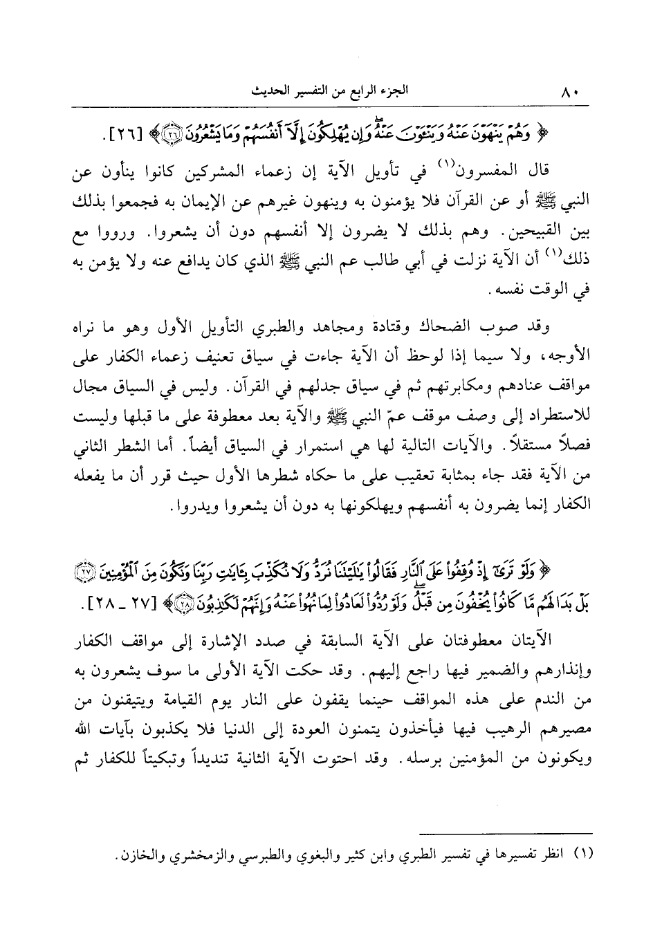 قال المفسرون «1» في تأويل الآية إن زعماء المشركين كانوا ينأون عن النبي صلى الله عليه وسلم أو عن القرآن فلا يؤمنون به وينهون غيرهم عن الإيمان به فجمعوا بذلك بين القبيحين. وهم بذلك لا يضرون إلا أنفسهم دون أن يشعروا. ورووا مع ذلك «2» أن الآية نزلت في أبي طالب عم النبي صلى الله عليه وسلم الذي كان يدافع عنه ولا يؤمن به في الوقت نفسه.