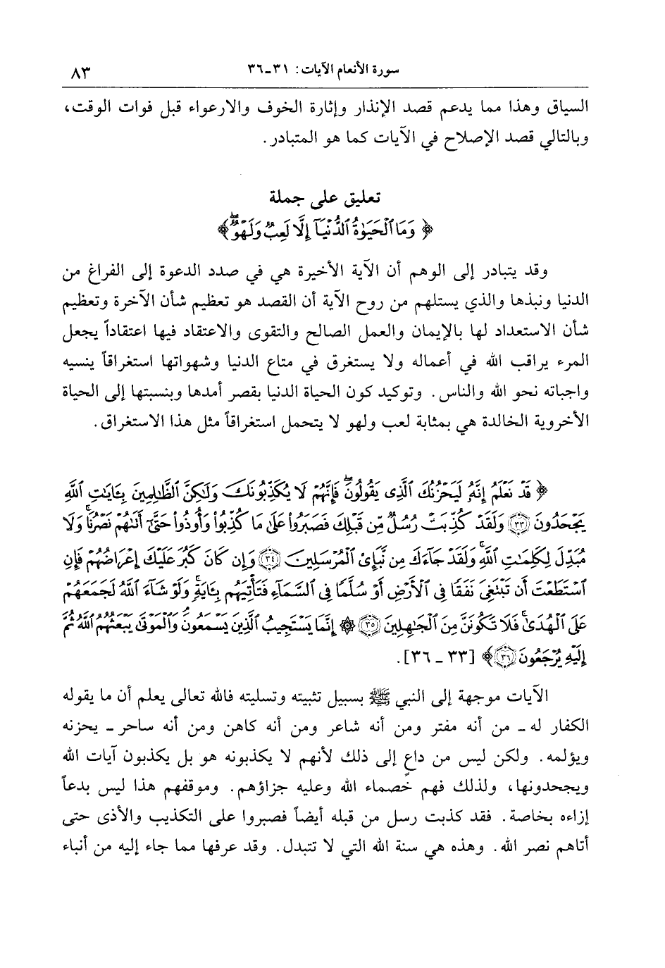 قَدْ نَعْلَمُ إِنَّهُ لَيَحْزُنُكَ الَّذِي يَقُولُونَ فَإِنَّهُمْ لا يُكَذِّبُونَكَ وَلكِنَّ الظَّالِمِينَ بِآياتِ اللَّهِ يَجْحَدُونَ (33) وَلَقَدْ كُذِّبَتْ رُسُلٌ مِنْ قَبْلِكَ فَصَبَرُوا عَلى ما كُذِّبُوا وَأُوذُوا حَتَّى أَتاهُمْ نَصْرُنا وَلا مُبَدِّلَ لِكَلِماتِ اللَّهِ وَلَقَدْ جاءَكَ مِنْ نَبَإِ الْمُرْسَلِينَ (34) وَإِنْ كانَ كَبُرَ عَلَيْكَ إِعْراضُهُمْ فَإِنِ اسْتَطَعْتَ أَنْ تَبْتَغِيَ نَفَقاً فِي الْأَرْضِ أَوْ سُلَّماً فِي السَّماءِ فَتَأْتِيَهُمْ بِآيَةٍ وَلَوْ شاءَ اللَّهُ لَجَمَعَهُمْ عَلَى الْهُدى فَلا تَكُونَنَّ مِنَ الْجاهِلِينَ (35) إِنَّما يَسْتَجِيبُ الَّذِينَ يَسْمَعُونَ وَالْمَوْتى يَبْعَثُهُمُ اللَّهُ ثُمَّ إِلَيْهِ يُرْجَعُونَ (36)