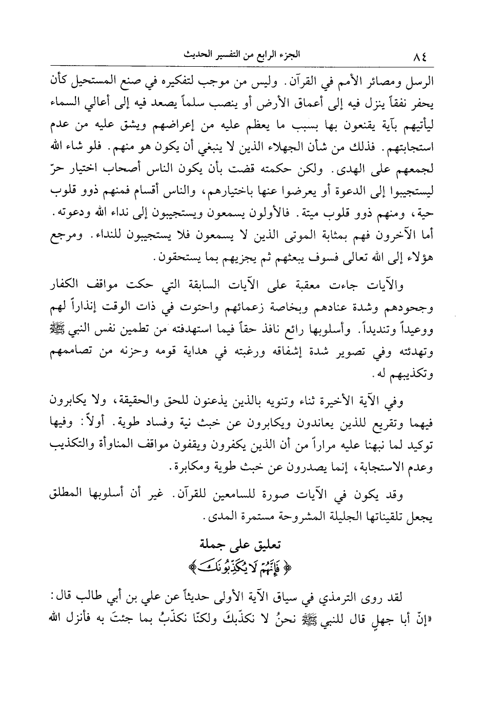 «إنّ أبا جهل قال للنبي صلى الله عليه وسلم نحن لا نكذّبك ولكنّا نكذّب بما جئت به فأنزل الله