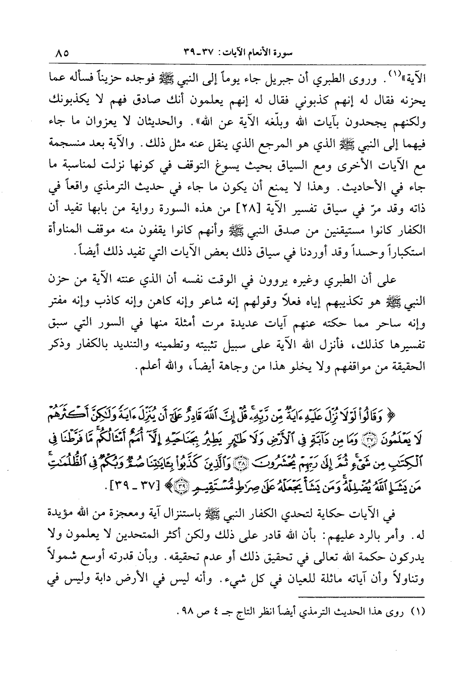 على أن الطبري وغيره يروون في الوقت نفسه أن الذي عنته الآية من حزن النبي صلى الله عليه وسلم هو تكذيبهم إياه فعلا وقولهم إنه شاعر وإنه كاهن وإنه كاذب وإنه مفتر وإنه ساحر مما حكته عنهم آيات عديدة مرت أمثلة منها في السور التي سبق تفسيرها كذلك، فأنزل الله الآية على سبيل تثبيته وتطمينه والتنديد بالكفار وذكر الحقيقة من مواقفهم ولا يخلو هذا من وجاهة أيضا، والله أعلم.