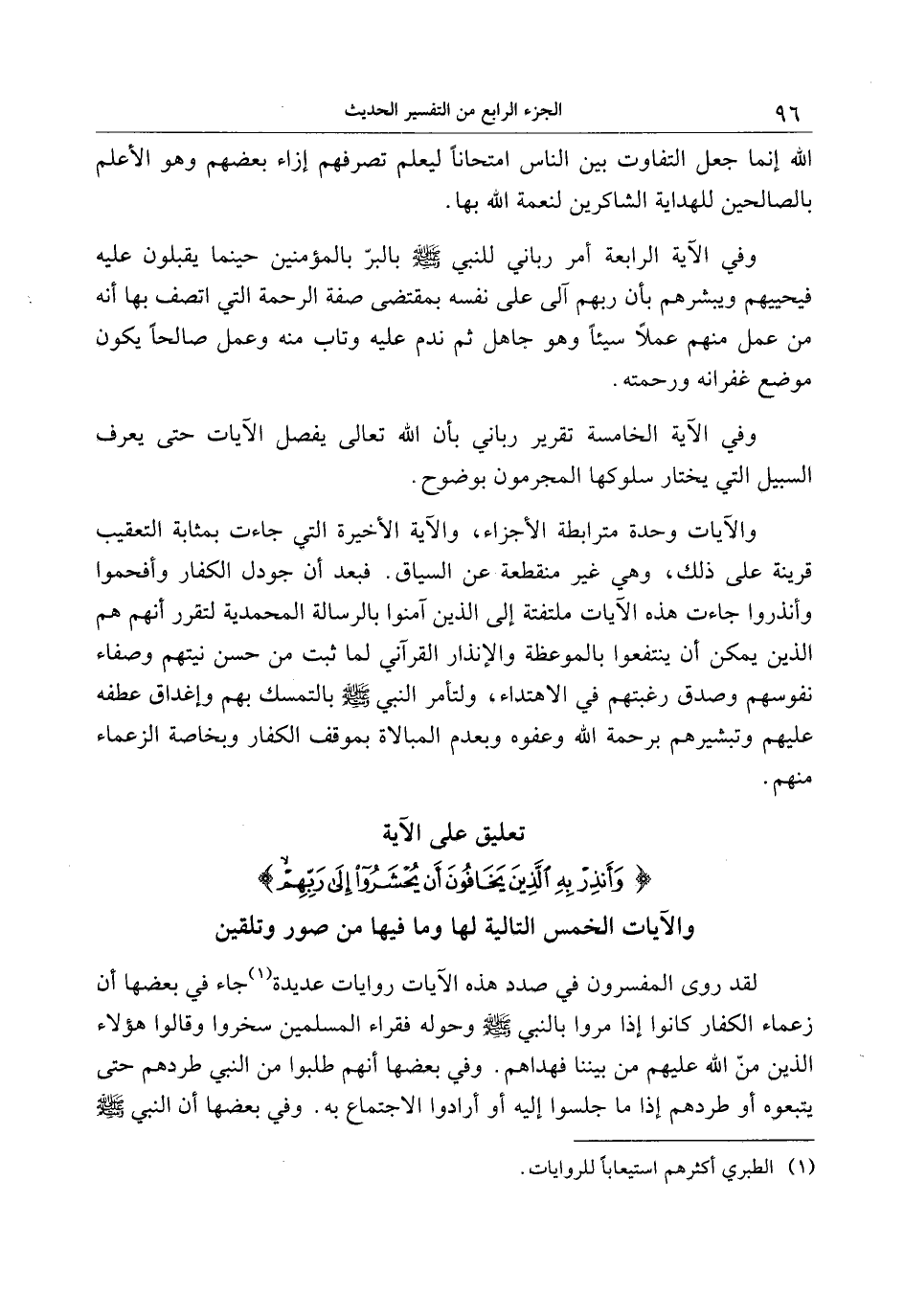 والآيات وحدة مترابطة الأجزاء، والآية الأخيرة التي جاءت بمثابة التعقيب قرينة على ذلك، وهي غير منقطعة عن السياق. فبعد أن جودل الكفار وأفحموا وأنذروا جاءت هذه الآيات ملتفتة إلى الذين آمنوا بالرسالة المحمدية لتقرر أنهم هم الذين يمكن أن ينتفعوا بالموعظة والإنذار القرآني لما ثبت من حسن نيتهم وصفاء نفوسهم وصدق رغبتهم في الاهتداء، ولتأمر النبي صلى الله عليه وسلم بالتمسك بهم وإغداق عطفه عليهم وتبشيرهم برحمة الله وعفوه وبعدم المبالاة بموقف الكفار وبخاصة الزعماء منهم.