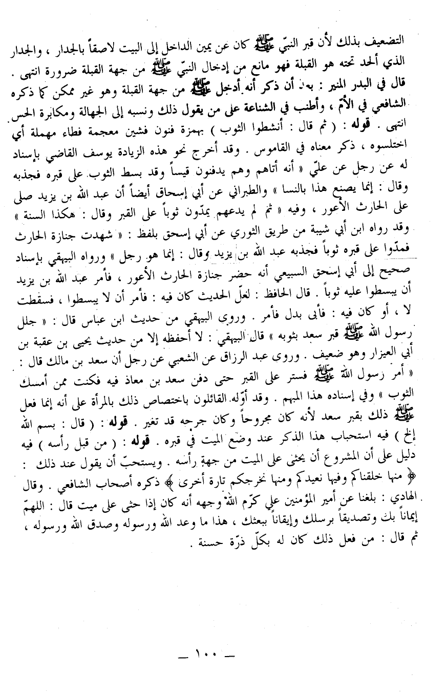 ـــــــــــــــــــــــــــــQالتَّضْعِيفِ بِذَلِكَ؛ لِأَنَّ قَبْرَ النَّبِيِّ - صَلَّى اللَّهُ عَلَيْهِ وَسَلَّمَ - كَانَ عَنْ يَمِينِ الدَّاخِلِ إلَى الْبَيْتِ لَاصِقًا بِالْجِدَارِ، وَالْجِدَارُ الَّذِي أُلْحِدَ تَحْتَهُ هُوَ الْقِبْلَةُ فَهُوَ مَانِعٌ مِنْ إدْخَالِ النَّبِيِّ - صَلَّى اللَّهُ عَلَيْهِ وَسَلَّمَ - مِنْ جِهَةِ الْقِبْلَةِ ضَرُورَةً انْتَهَى