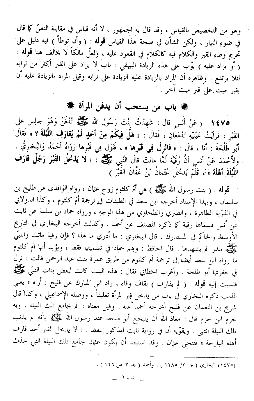 1475 - (عَنْ أَنَسٍ قَالَ: «شَهِدْتُ بِنْتَ رَسُولِ اللَّهِ - صَلَّى اللَّهُ عَلَيْهِ وَسَلَّمَ - تُدْفَنُ وَهُوَ جَالِسٌ عَلَى الْقَبْرِ، فَرَأَيْتُ عَيْنَيْهِ تَدْمَعَانِ، فَقَالَ: هَلْ فِيكُمْ مِنْ أَحَدٍ لَمْ يُقَارِفْ اللَّيْلَةَ؟ فَقَالَ أَبُو طَلْحَةَ: أَنَا، قَالَ: فَانْزِلْ فِي قَبْرِهَا، فَنَزَلَ فِي قَبْرِهَا» رَوَاهُ أَحْمَدُ وَالْبُخَارِيُّ وَلِأَحْمَدَ عَنْ أَنَسٍ أَنَّ رُقَيَّةَ لَمَّا مَاتَتْ قَالَ النَّبِيُّ - صَلَّى اللَّهُ عَلَيْهِ وَسَلَّمَ -: «لَا يَدْخُلْ الْقَبْرَ رَجُلٌ قَارَفَ اللَّيْلَةَ أَهْلَهُ» ، فَلَمْ يَدْخُلْ عُثْمَانُ بْنُ عَفَّانَ الْقَبْرَ)